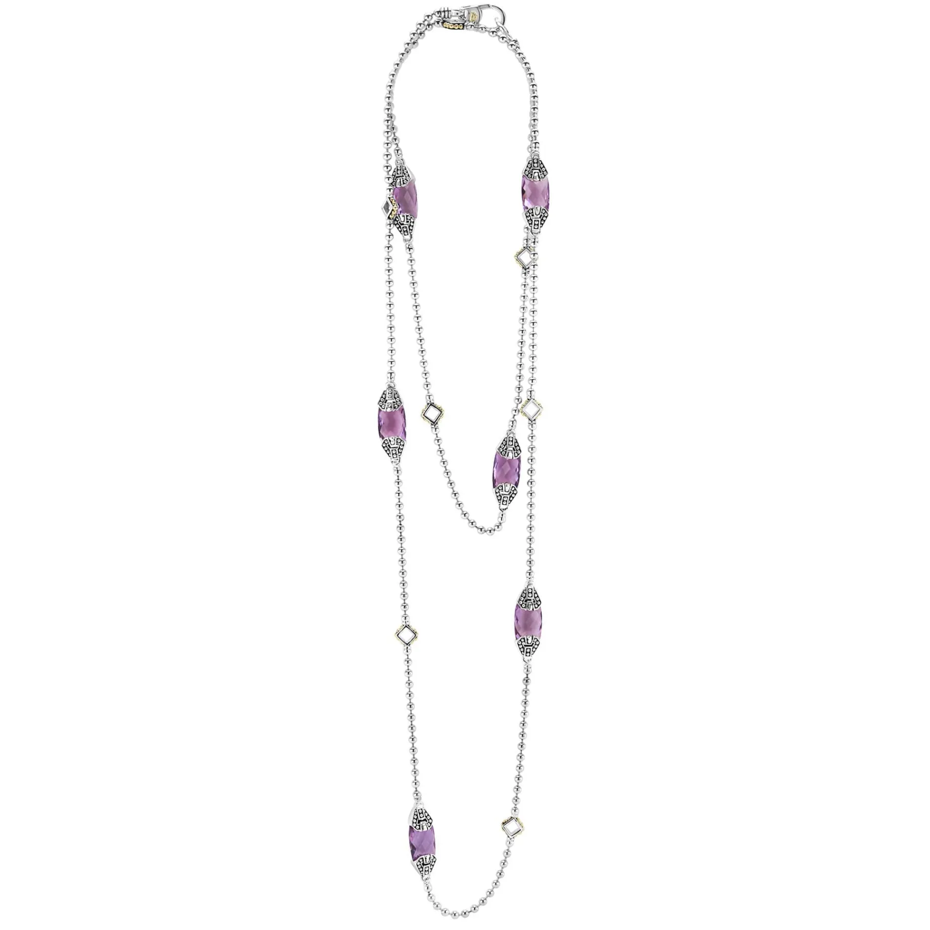 Six Amethyst Gemstone Stations Highlighted By Caviar Beading With Seven Sterling Silver Open Square Motifs Highlighted By 18K Gold On A Sterling Silver Ball Chain Strand.