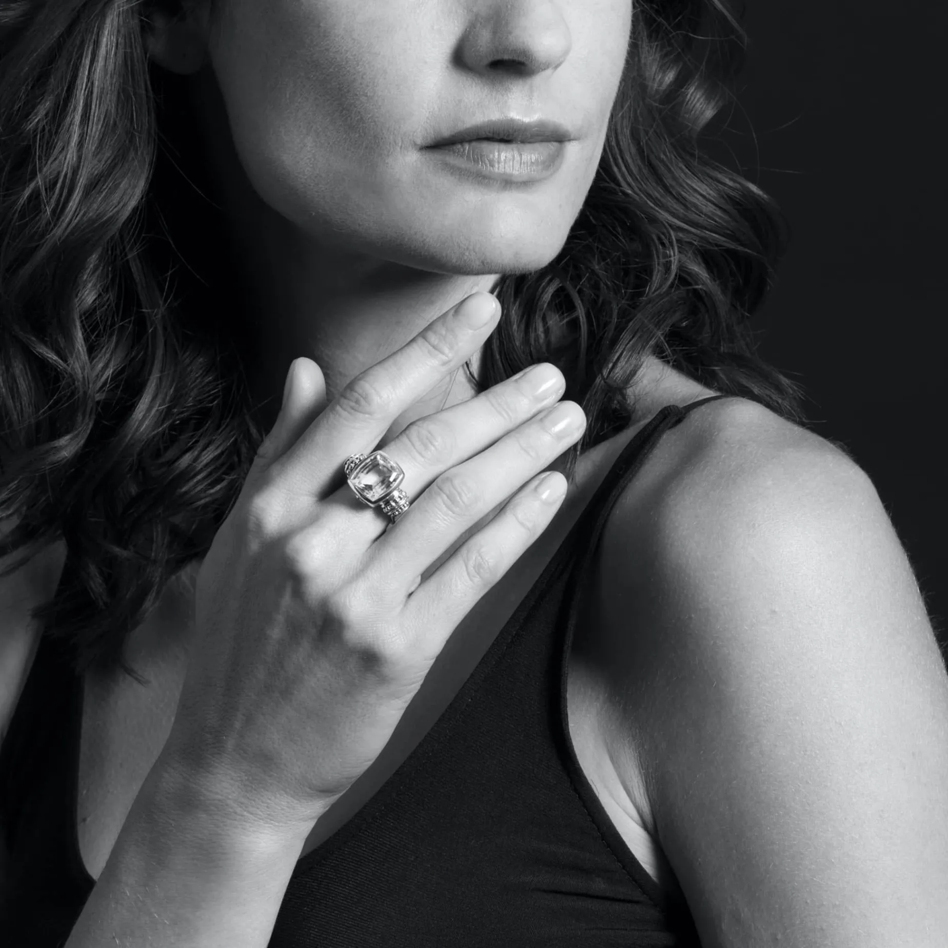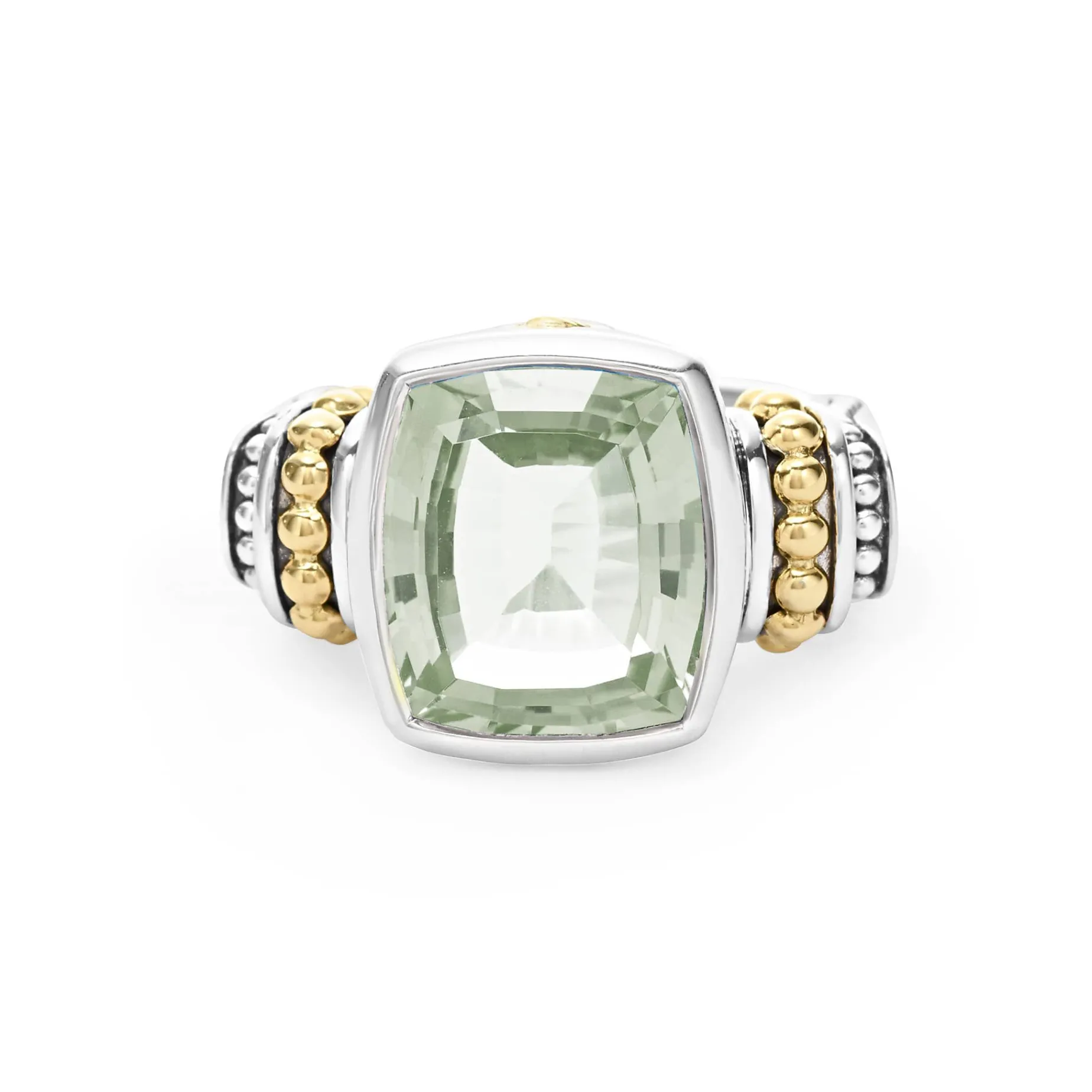 Prasiolite Bezel-Set Gemstone Ring With 18K Gold Caviar Beading On A Sterling Silver Band.