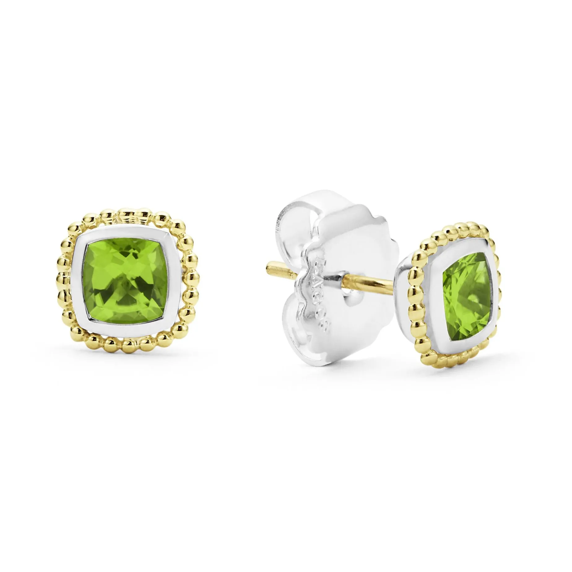 Peridot Gemstone Stud Earrings Surrounded By Smooth Sterling Silver And 18K Gold Caviar Beading.