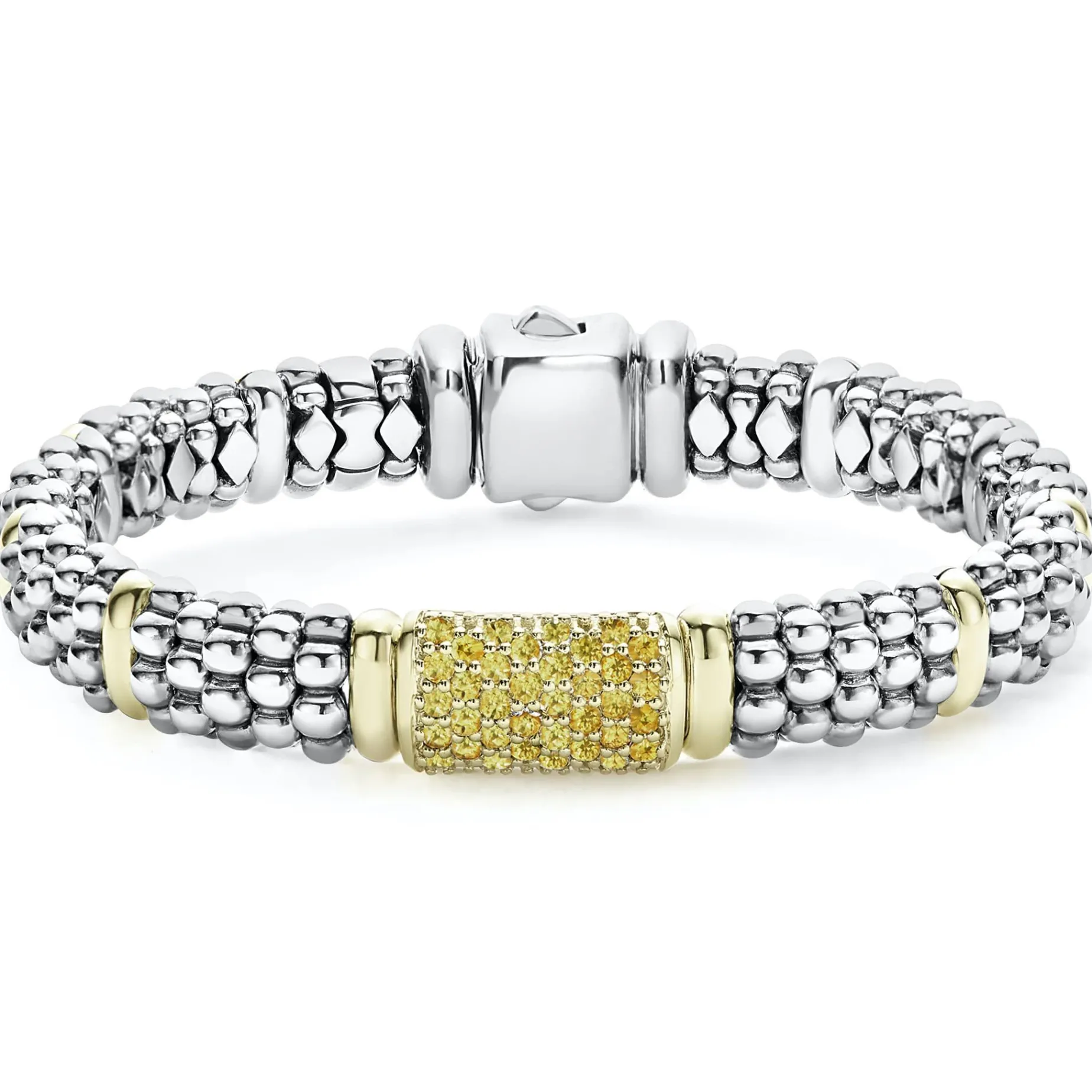 A Lagos Exclusive. Ten 18K Gold Stations Highlight This Sterling Silver Caviar Beaded Bracelet With A Pavé Station Of Yellow Sapphire Gemstones.