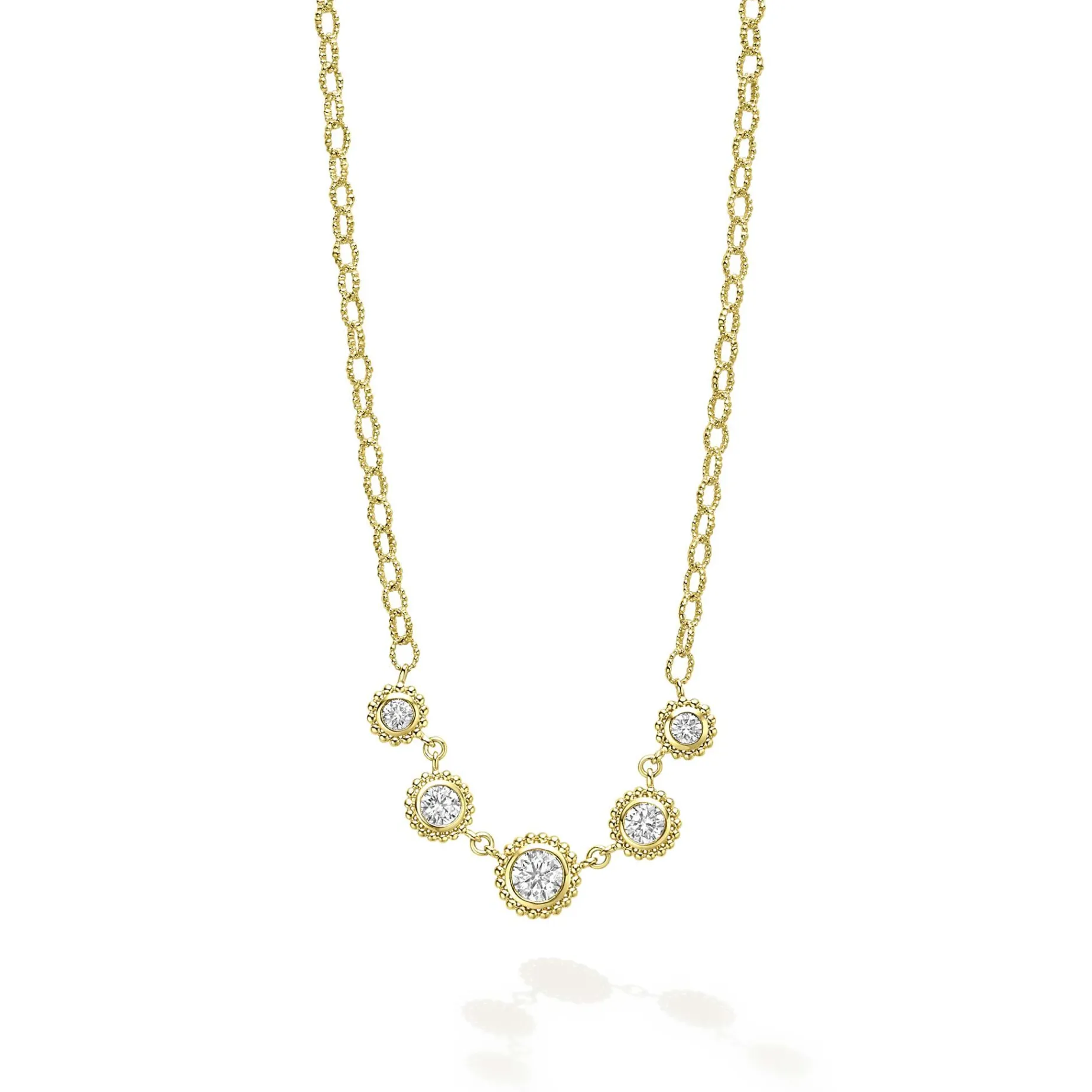 Five Diamond Circles Surrounded By 18K Gold Caviar Beading Forms This Link Necklace. Lagos Diamonds Are The Highest Quality Natural Stones.