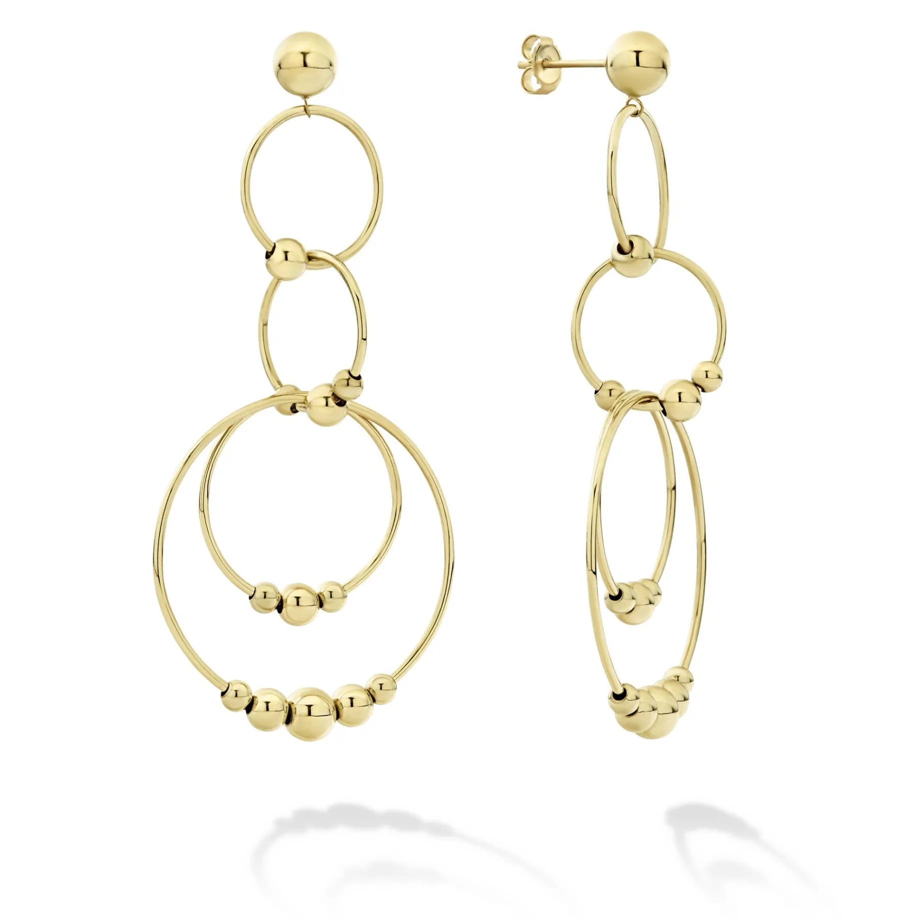 Long 18K Gold Drop Earrings With Four Circles And Caviar Beaded Ball Details.