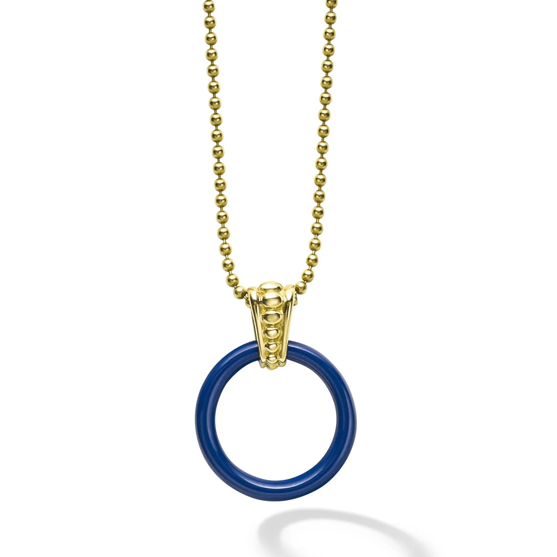An Ultramarine Ceramic Circle With An 18K Gold Caviar Beaded Accent Forms This Pendant On An 18K Gold Ball Chain Necklace.
