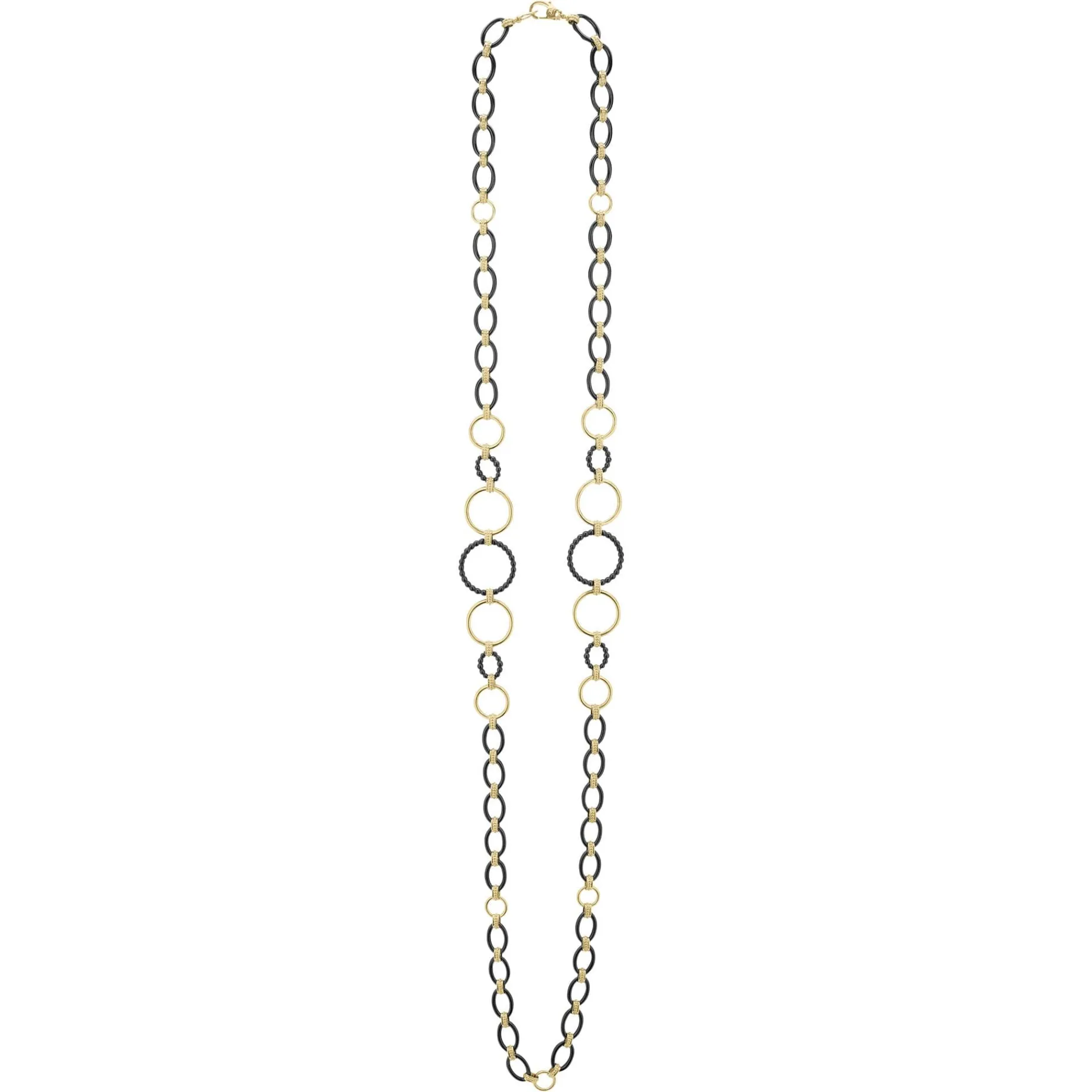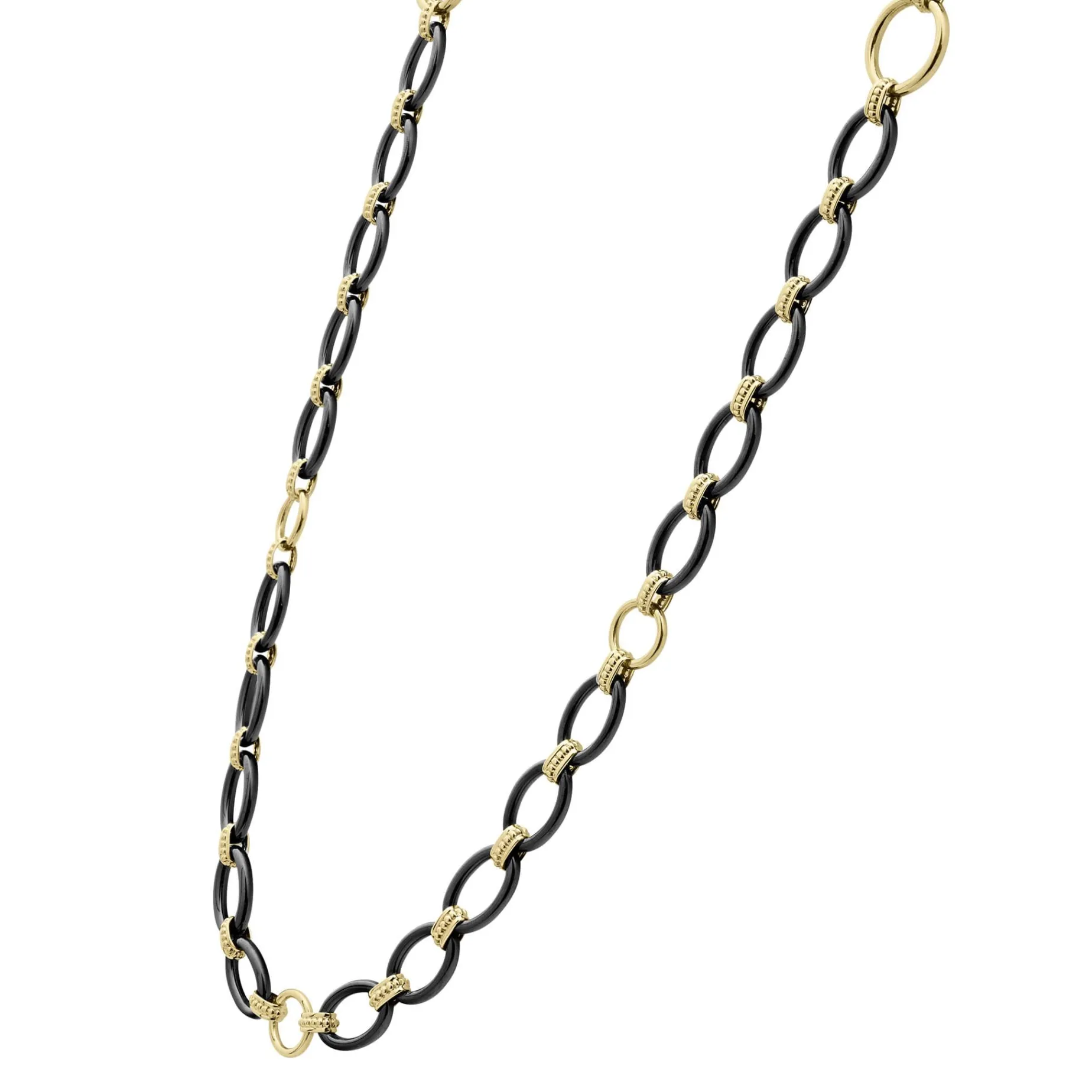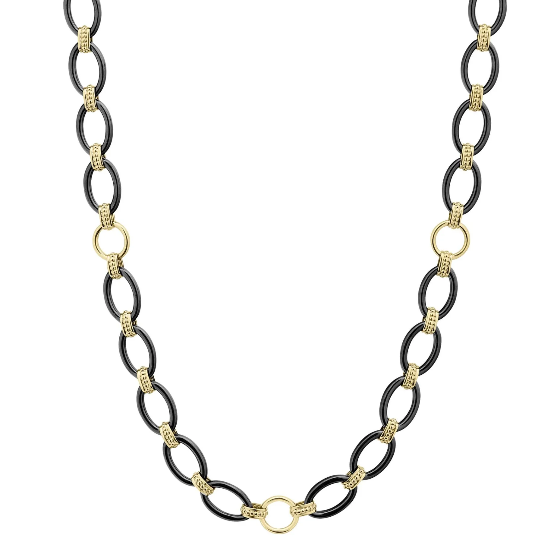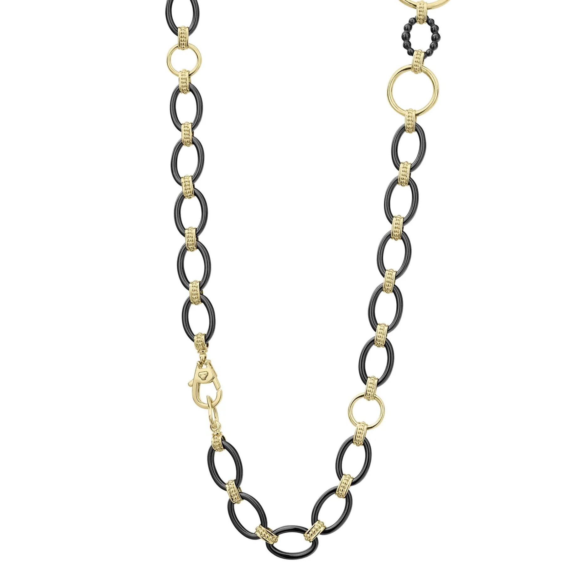 A 36 Inch Long Necklace With 18K Gold And Black Ceramic Round, Oval And Beaded Links.