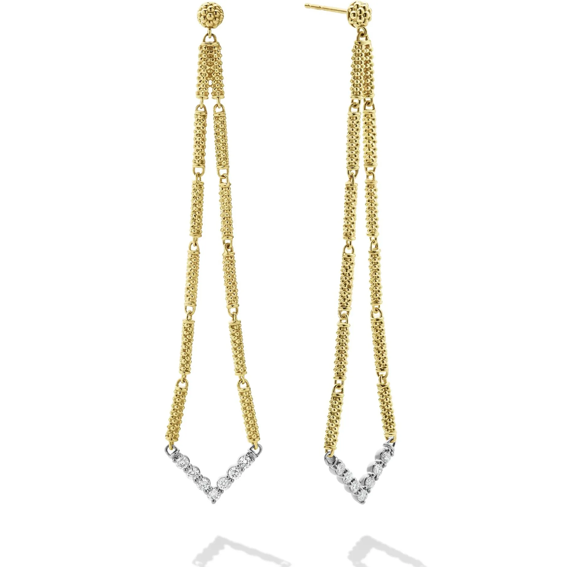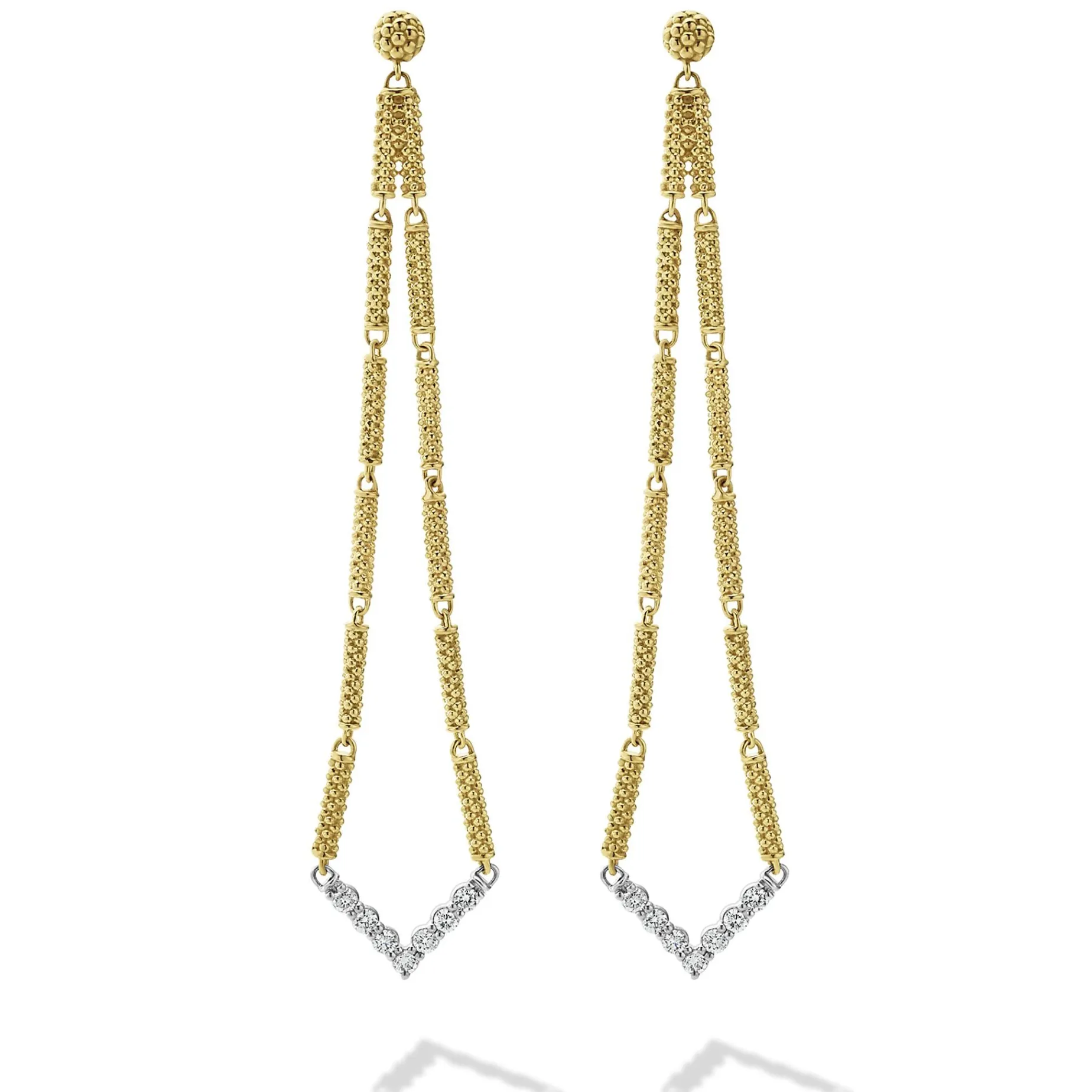18K Gold Superfine Caviar Beading And Diamonds Set In Chevron Shaped 18K White Gold Form These Dramatic Drop Earrings. Lagos Diamonds Are The Highest Quality Natural Stones.