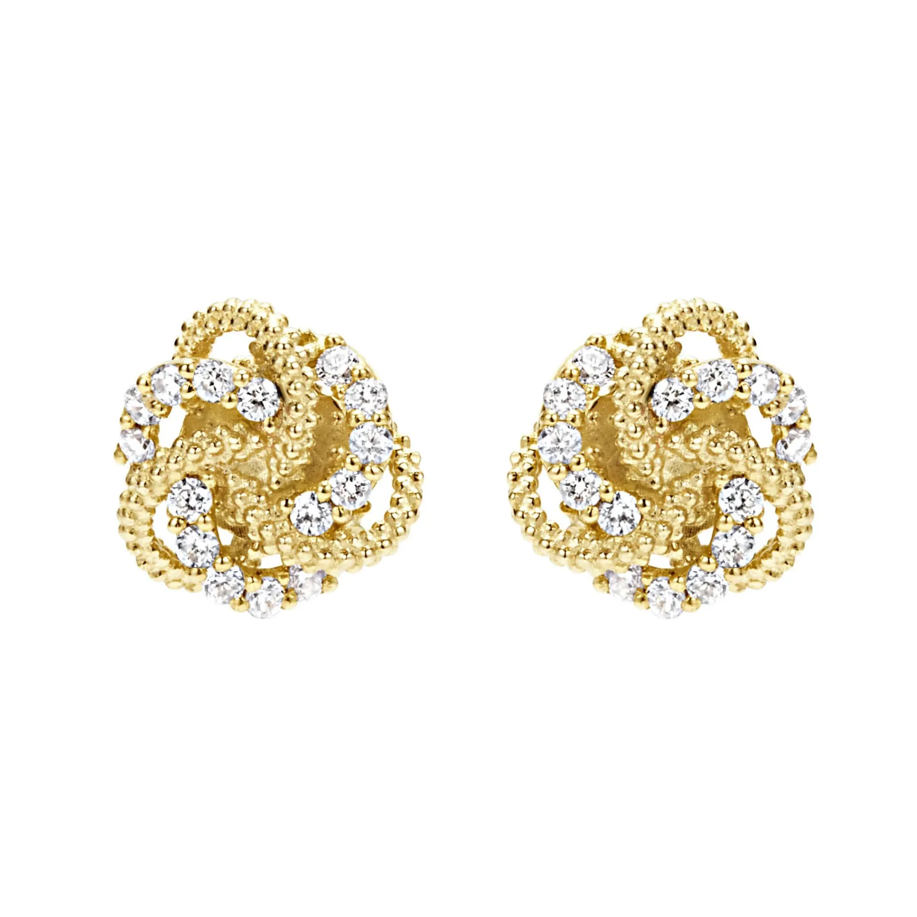 Love Knot Stud Earrings Formed Of Diamonds And 18K Gold Caviar Beaded Bands. Lagos Diamonds Are The Highest Quality Natural Stones.