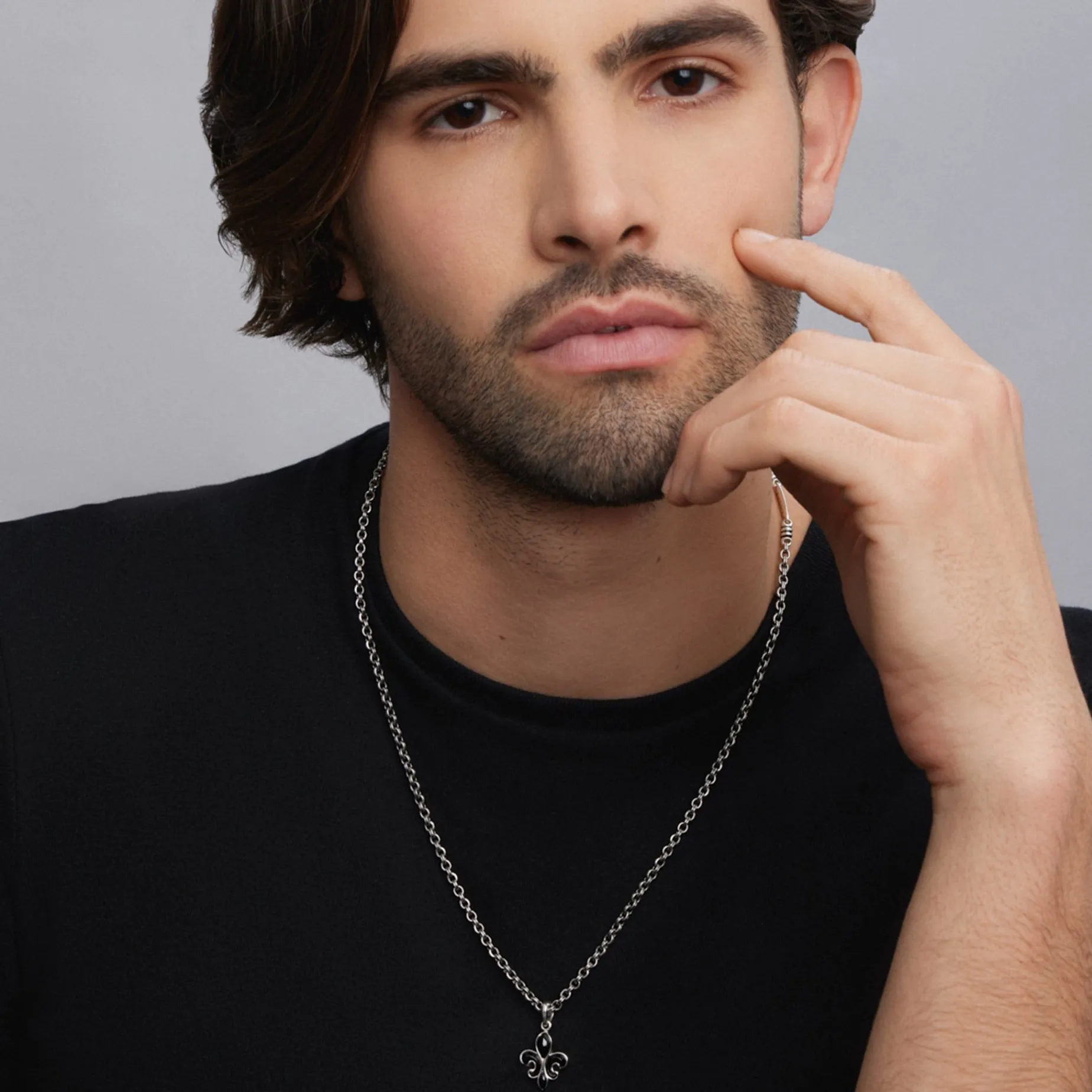 Black Agate Gemstone And Sterling Silver Form This Fleur De Lis Amulet. Finished On A 3Mm Double Link Chain Necklace.