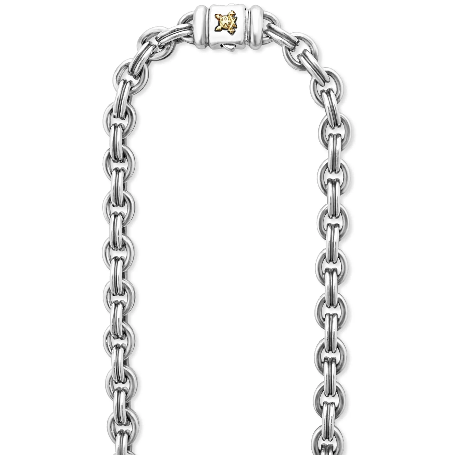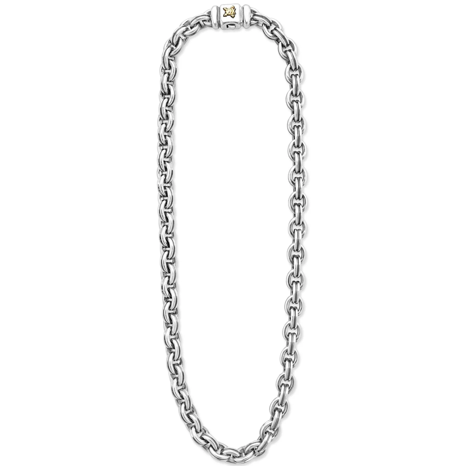 Smooth Sterling Silver Finished On A Double Link Chain Necklace Featuring An 18K Gold Krunch Crescent. Length Available In 20, 22, 24, And 26 Inches.