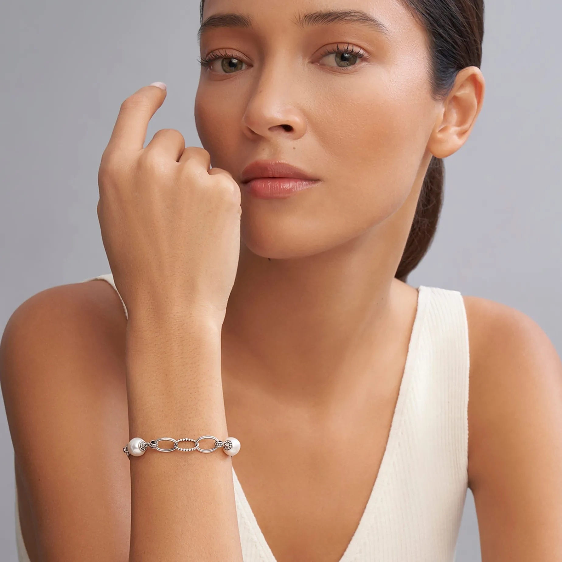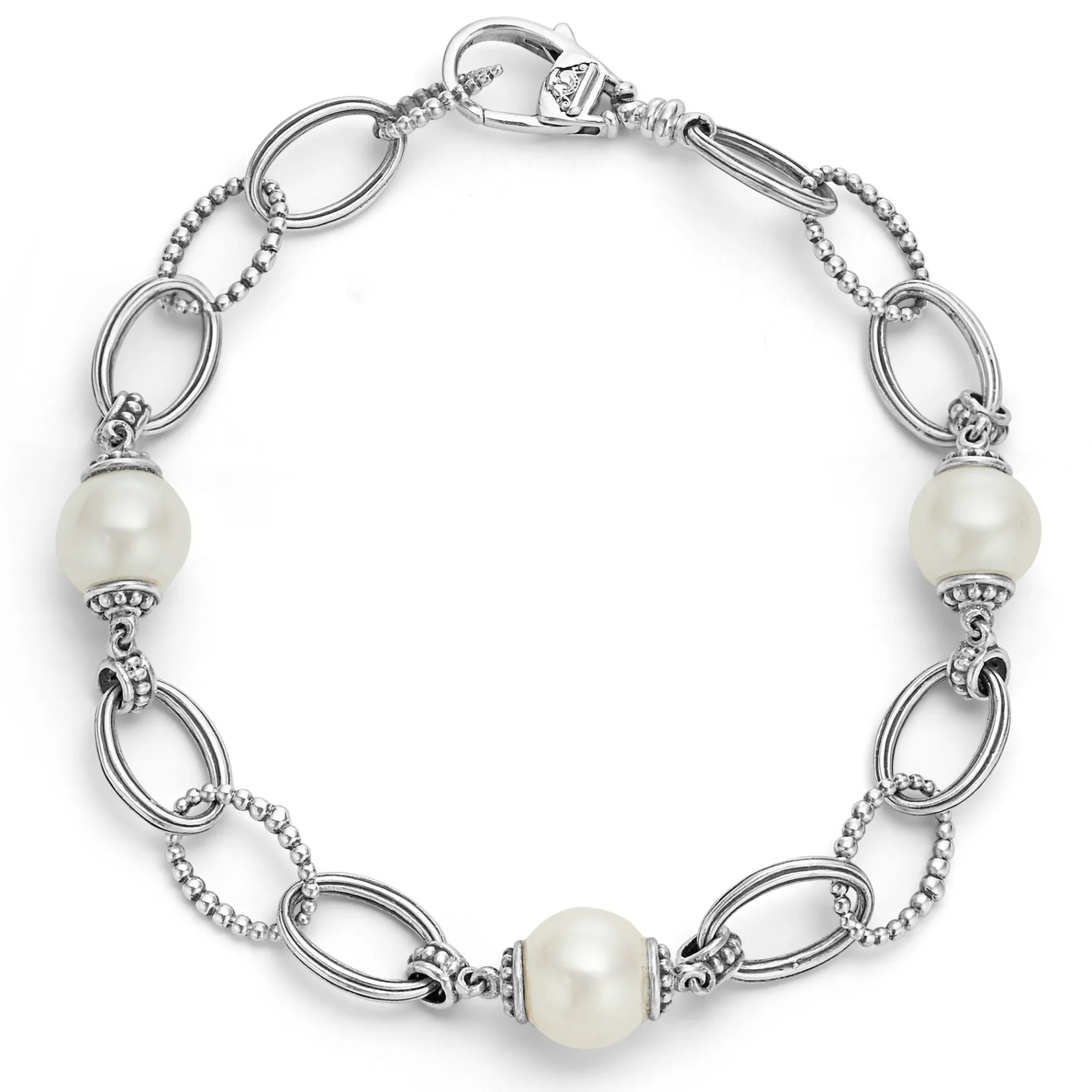 Three Cultured Freshwater Pearl Stations Accent This Sterling Silver Bracelet With Caviar Beaded Circle Link Accents.