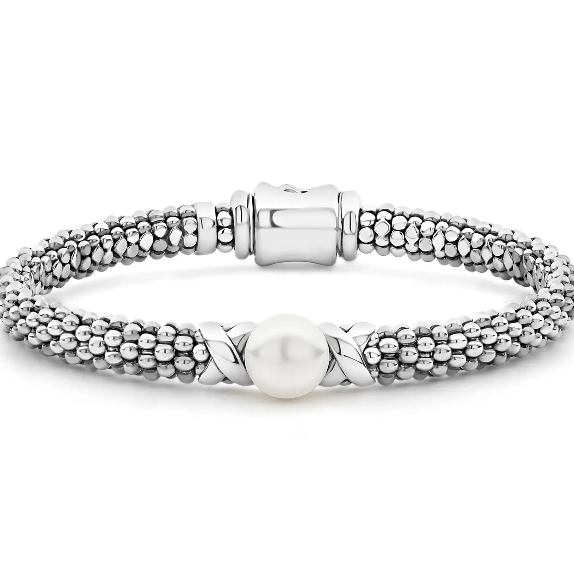 A Classic Caviar Bracelet With Freshwater Cultured Pearl Framed By Two Sterling Silver X Stations.