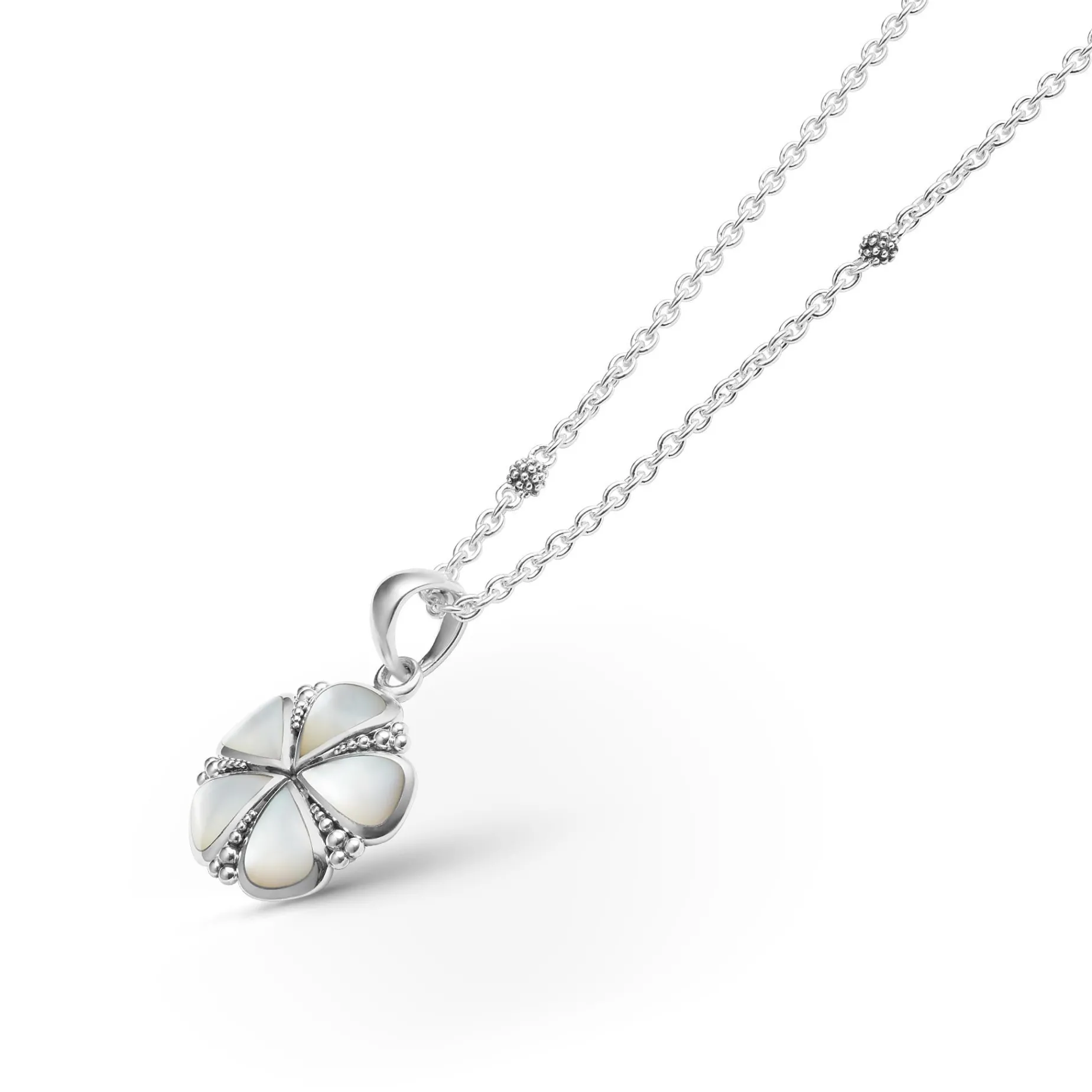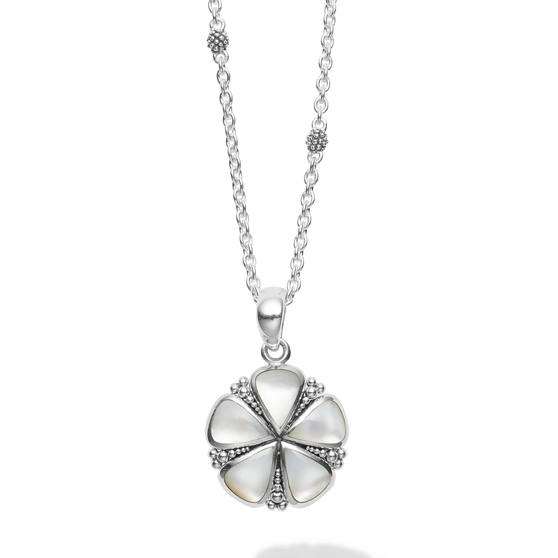 A Lagos Exclusive. Our Unique White Mother Of Pearl Flower Pendant Finished On A Versatile Link Necklace With Six Sterling Silver Caviar Beaded Stations.
