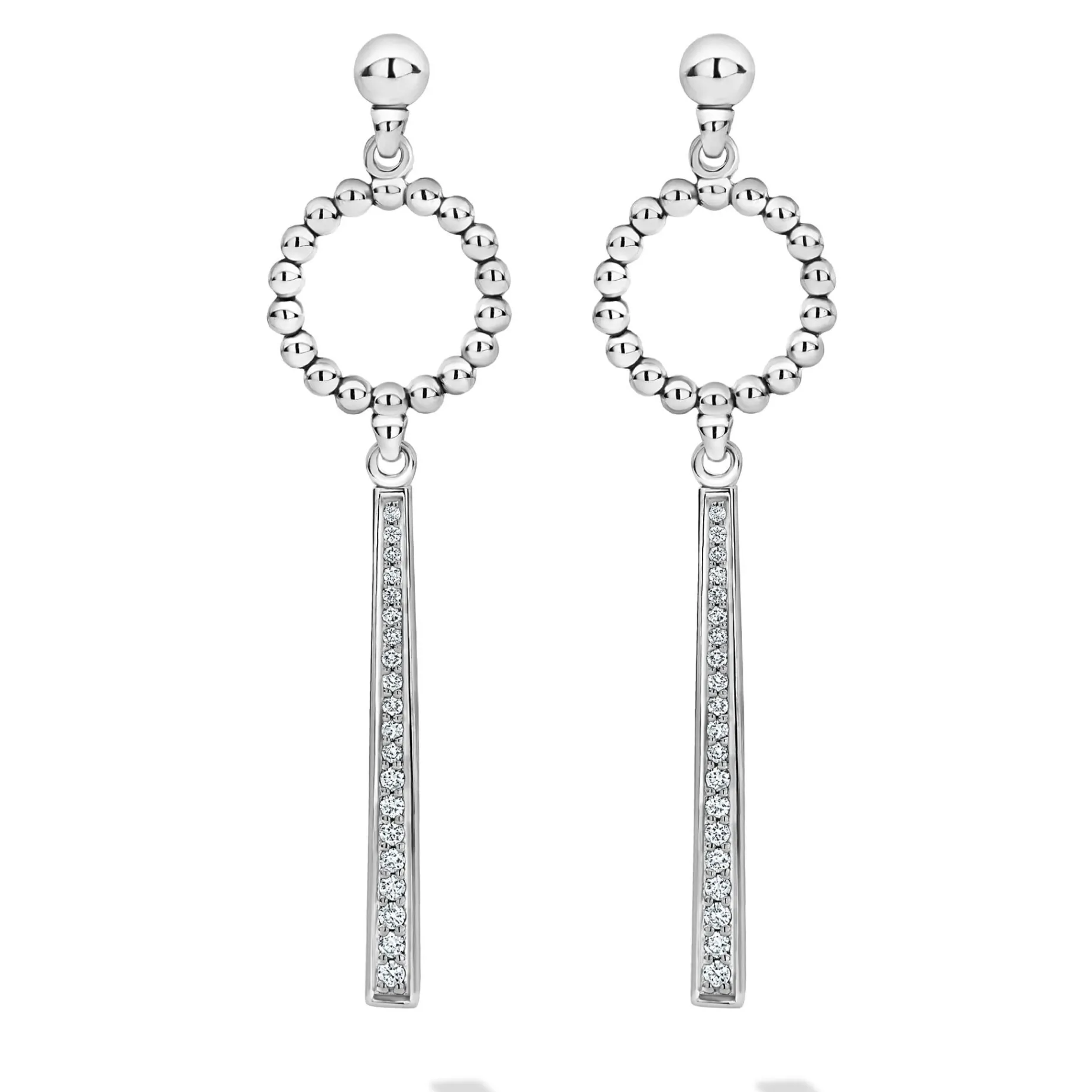 Sterling Silver Caviar Beaded Circle Drop Earrings With A Long, Linear Diamond Station. Lagos Diamonds Are The Highest Quality Natural Stones.