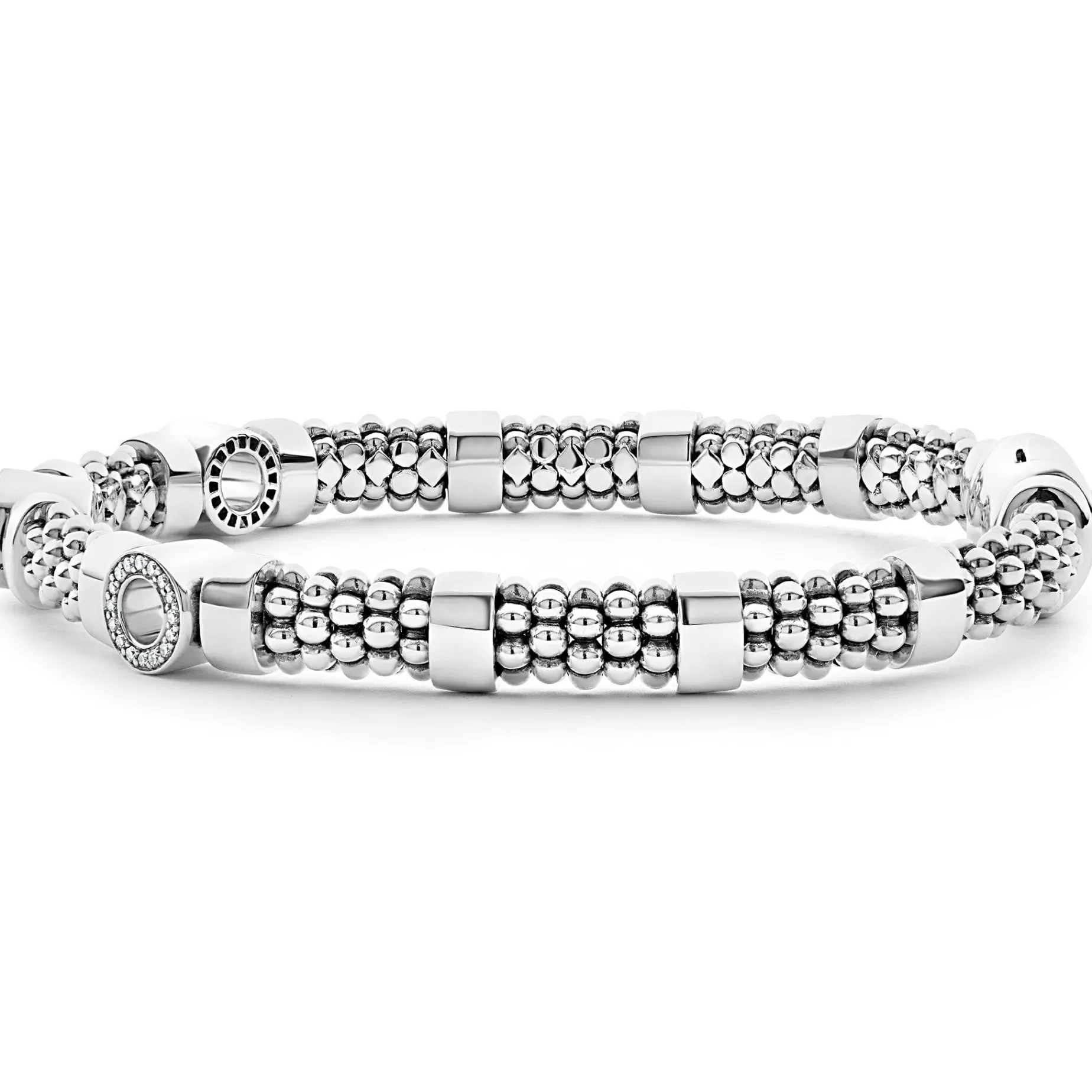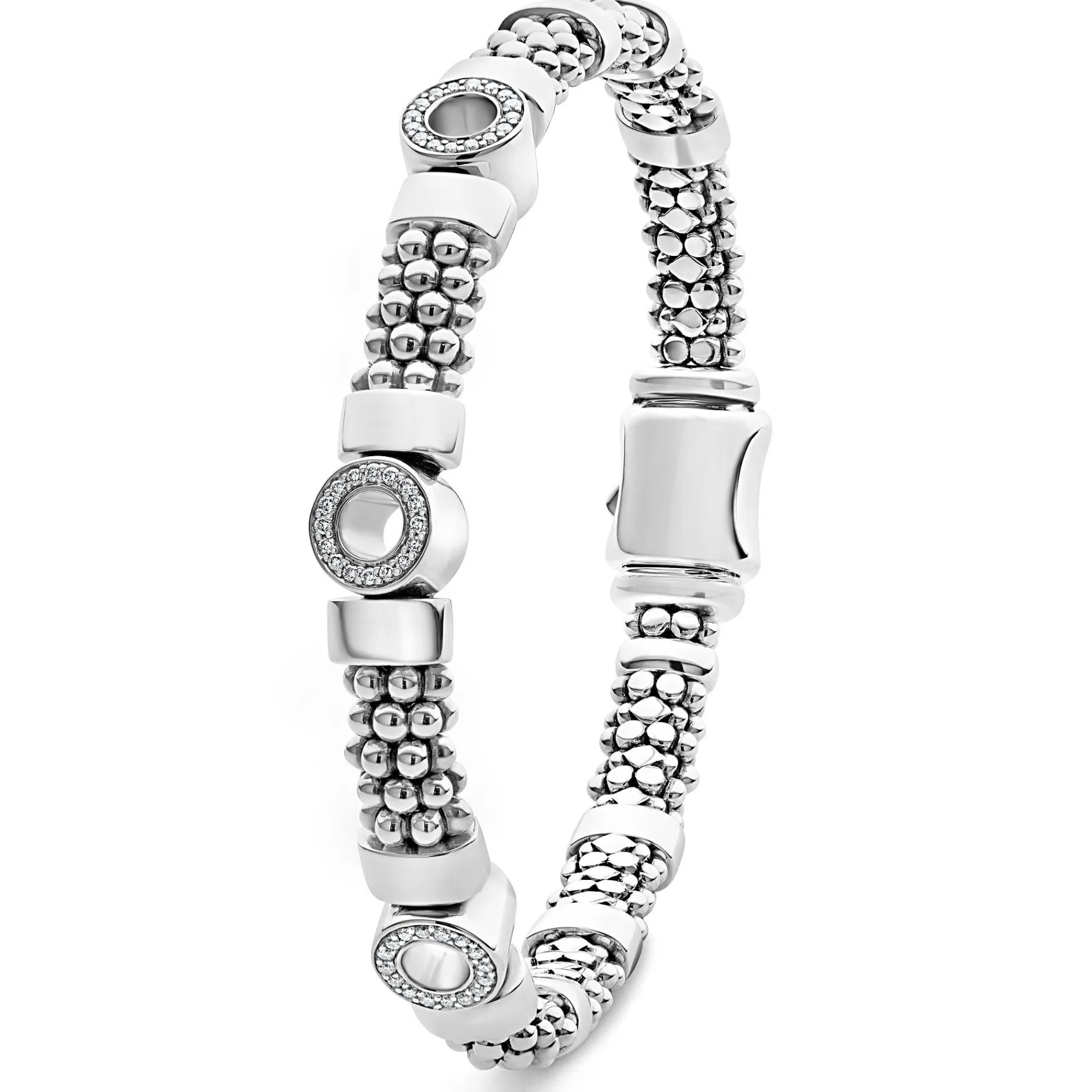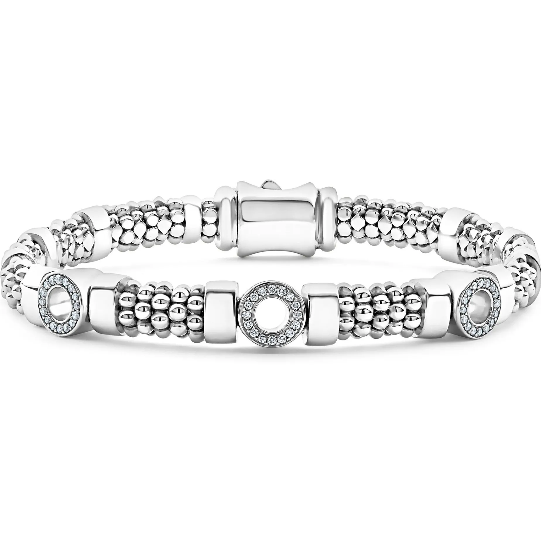 A Sterling Silver Bracelet With Three Diamond Circle Stations. Lagos Diamonds Are The Highest Quality Natural Stones.