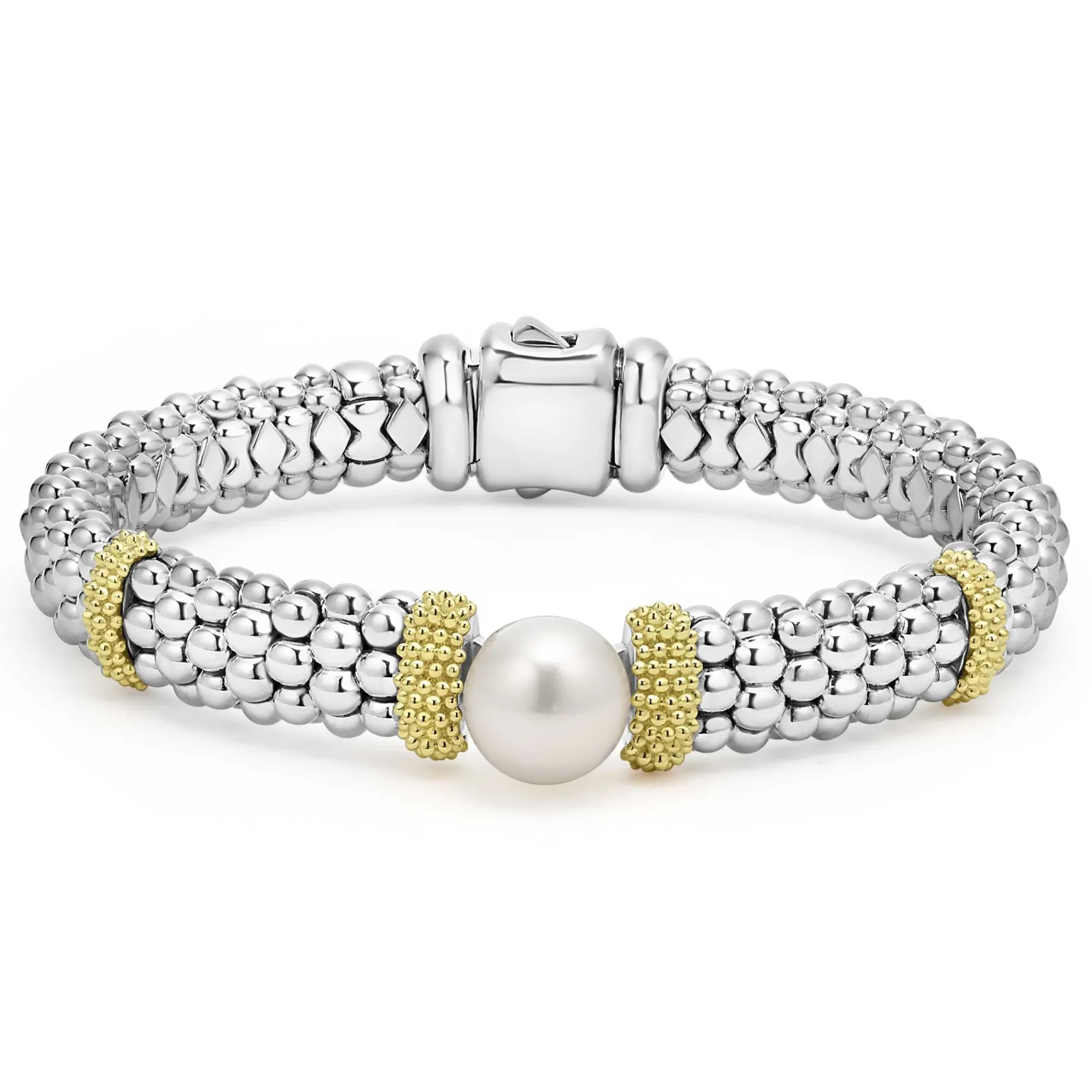 A Sterling Silver Caviar Bracelet With A Freshwater Cultured Pearl Accented By 18K Gold Stations.