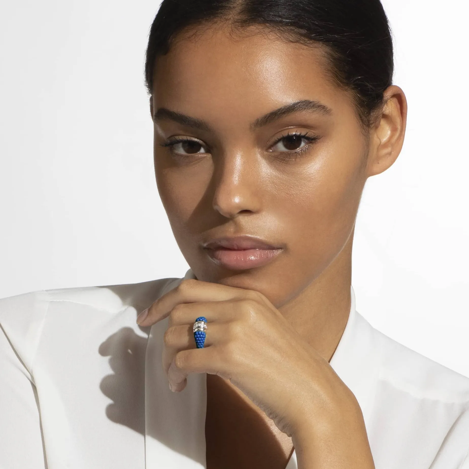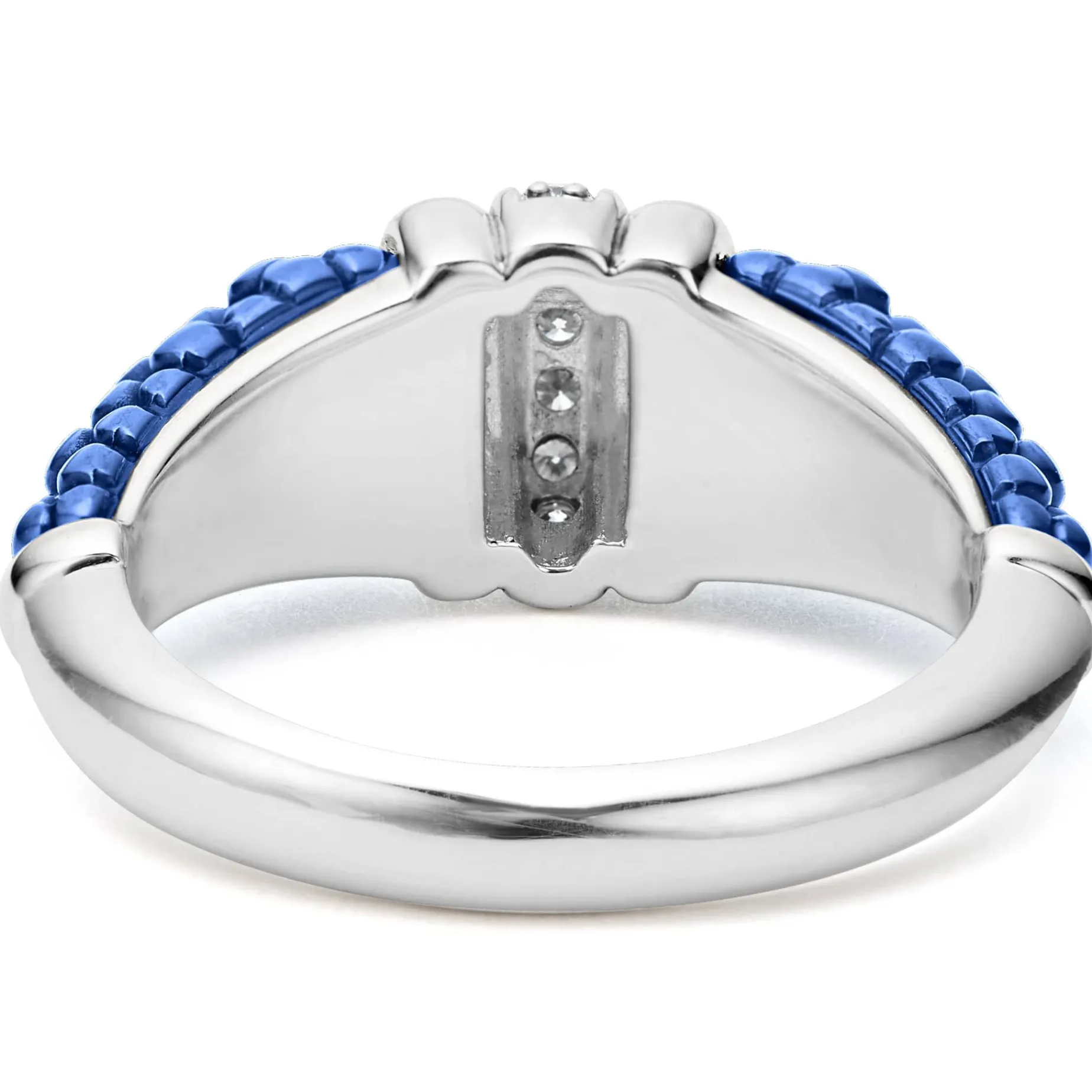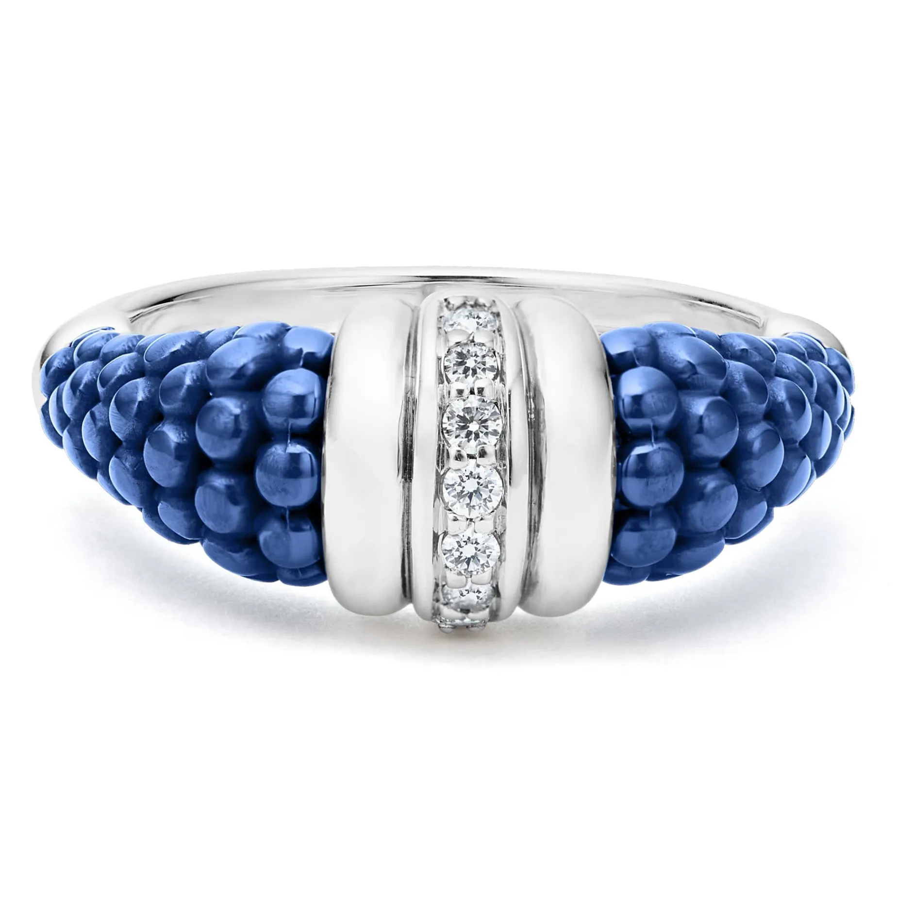 Ultramarine Ceramic Caviar Ring With A Row Of Diamonds And Highly Polished Sterling Silver. Lagos Diamonds Are The Highest Quality Natural Stones.