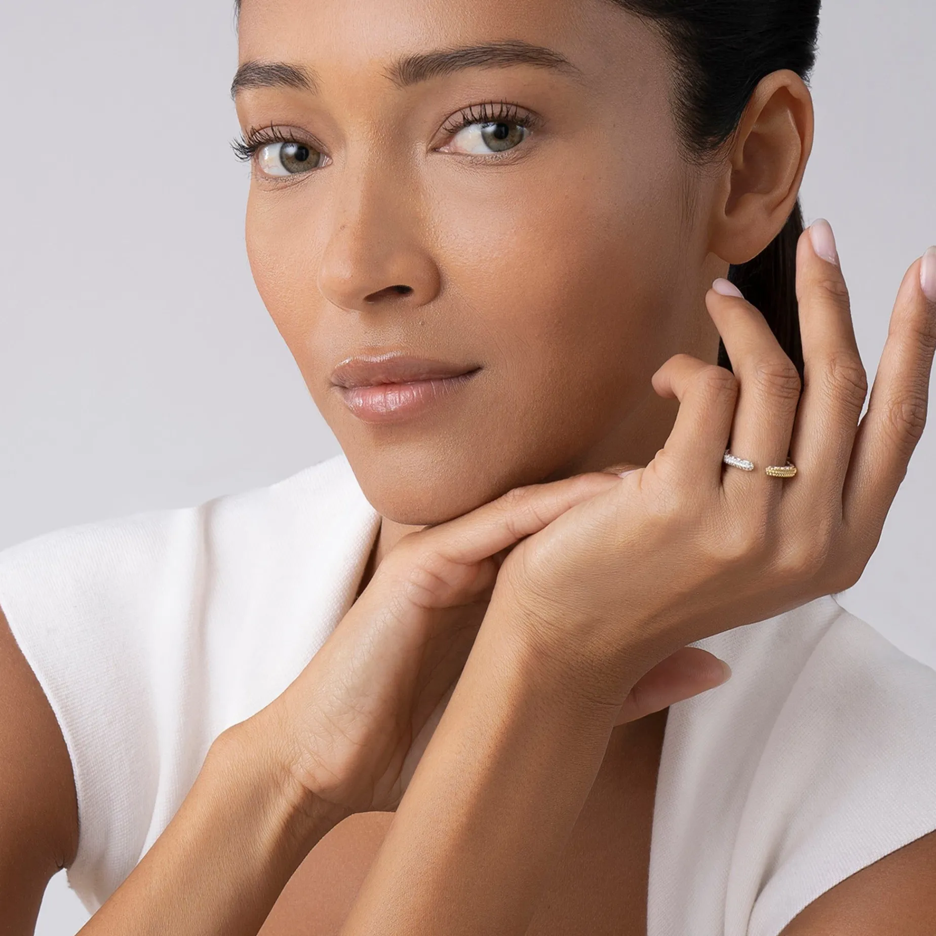 Diamond Open Stacking Ring With 18K Gold And Sterling Silver Caviar Beading. Ideal To Pair With Other Stacking Rings. Lagos Diamonds Are The Highest Quality Natural Stones.