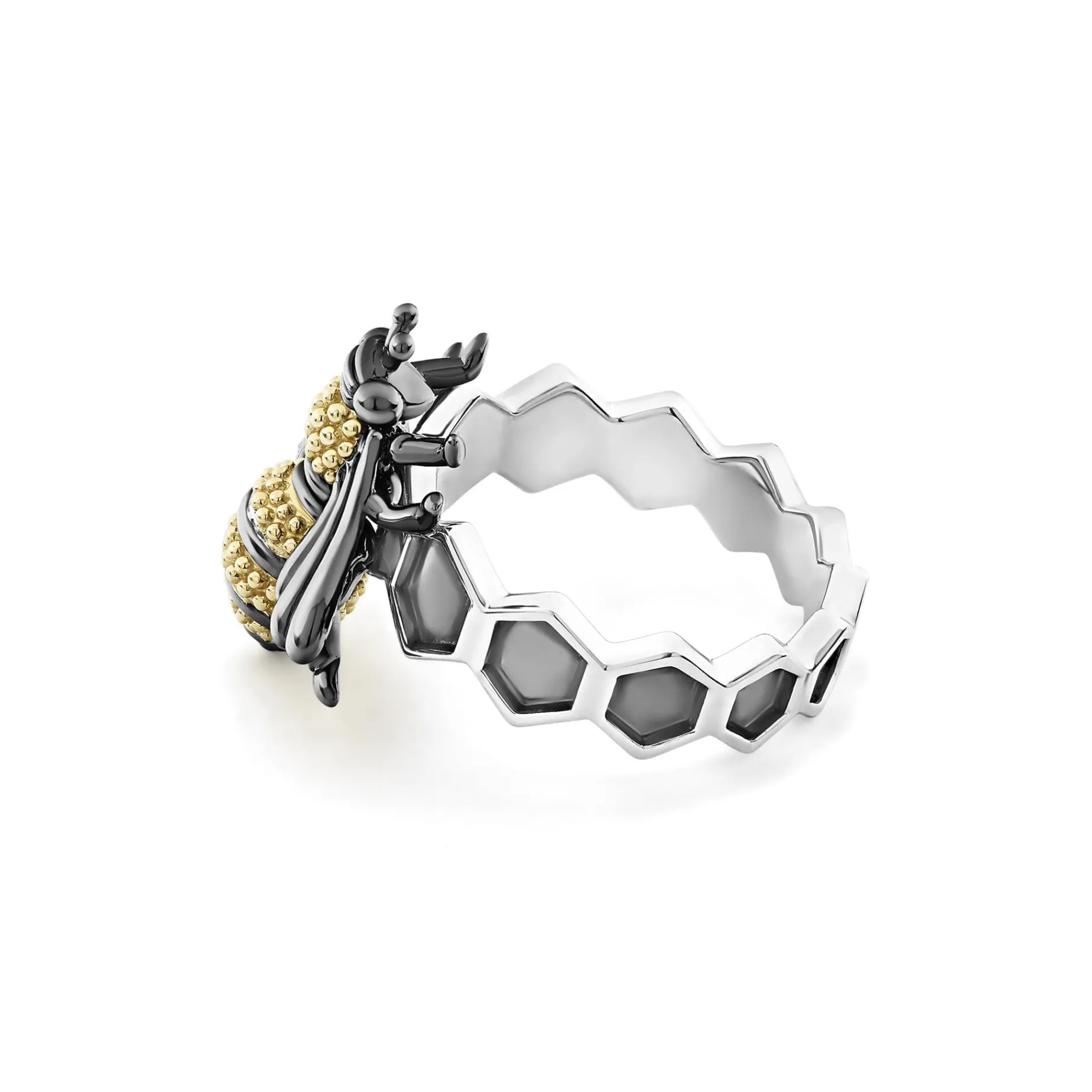 Honeybee Ring With 18K Gold Caviar Beading And Black Rhodium On Sterling Silver With A Honeycomb Band.