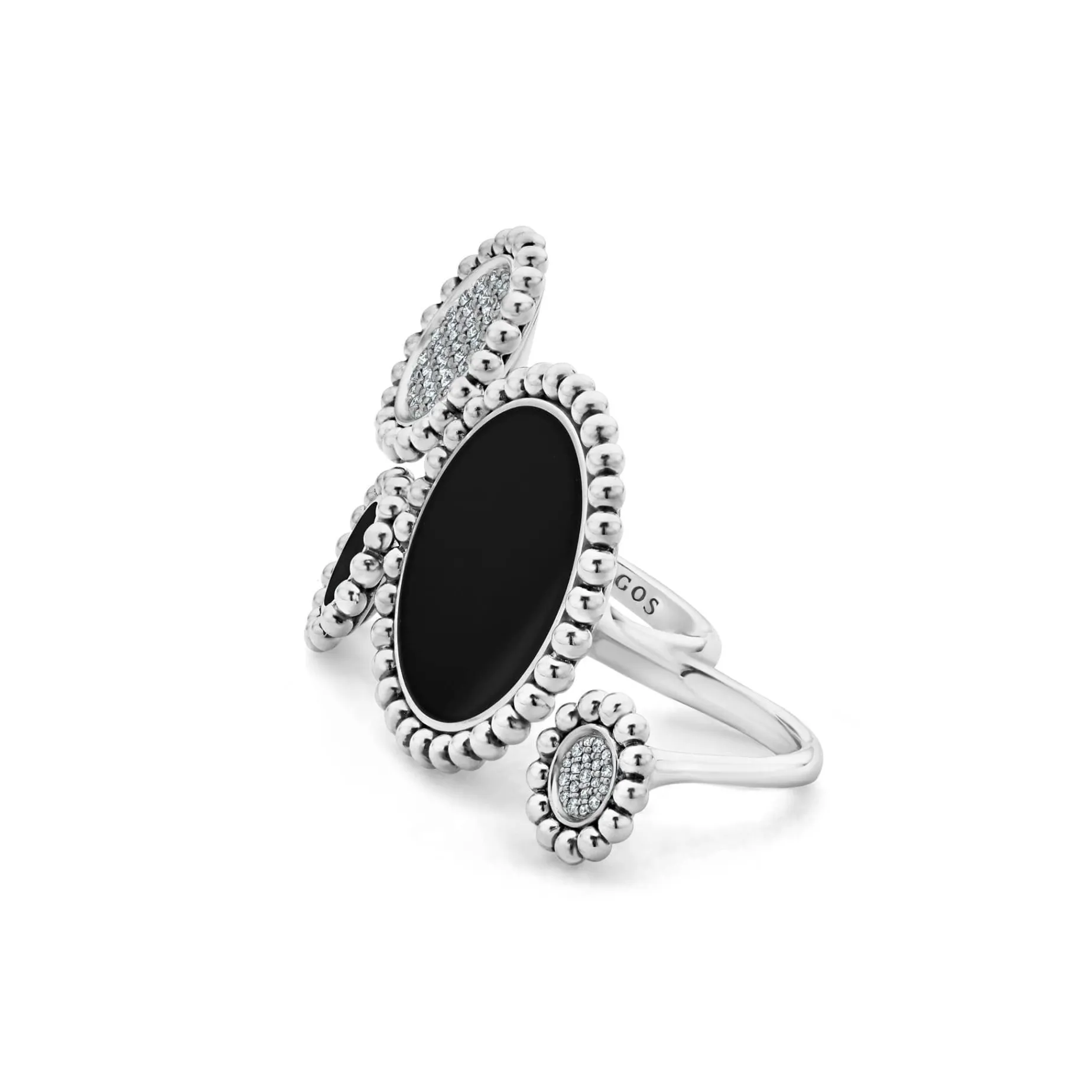 Diamond And Onyx Statement Ring With Sterling Silver Caviar Beading. Onyx Is A Natural Deep Black Stone. Lagos Diamonds Are The Highest Quality Natural Stones.