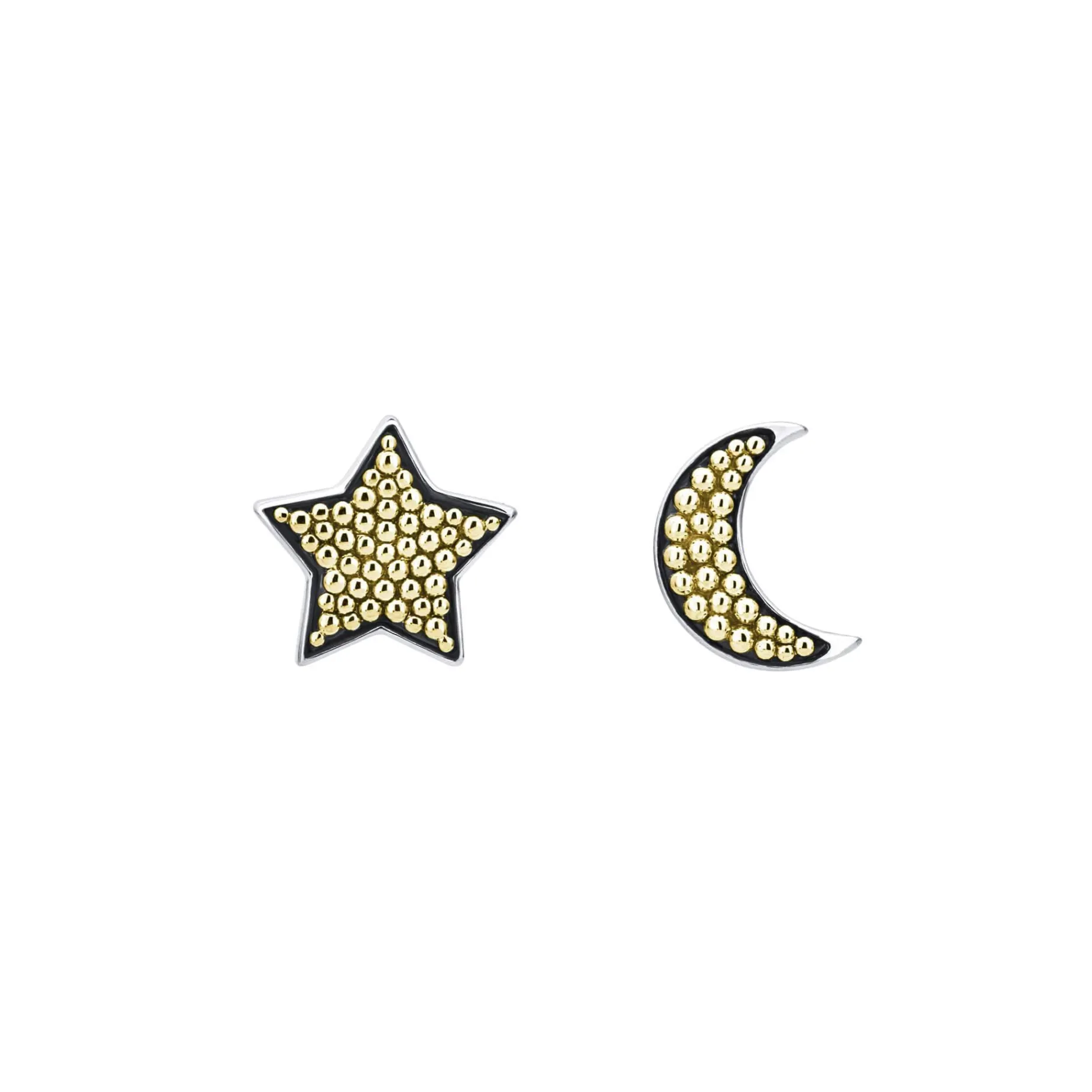 Sterling Silver And 18K Gold Caviar Beading Form These Moon And Star Earrings.