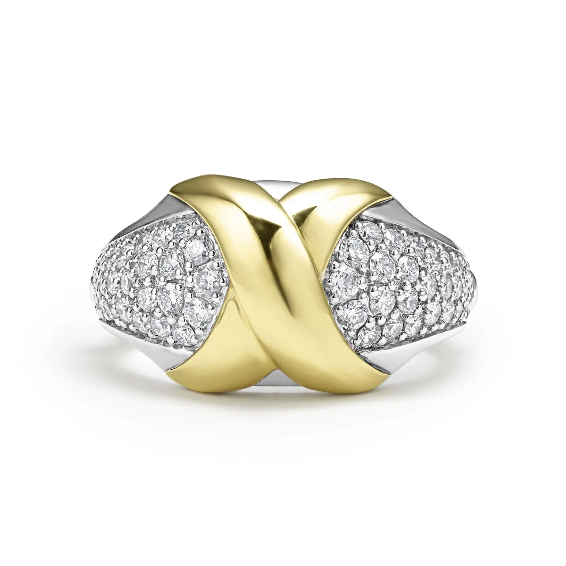 An 18K Gold X-Motif Surrounded By Diamonds Forms This Statement Ring. Lagos Diamonds Are The Highest Quality Natural Stones.