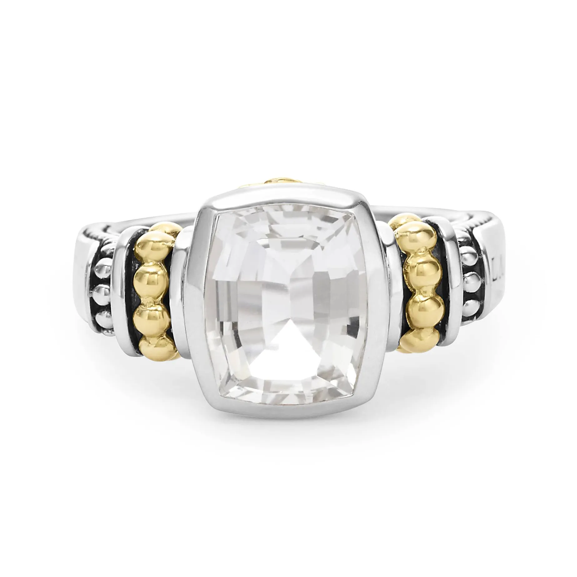 White Topaz Bezel-Set Gemstone Ring With 18K Caviar Beading On A Sterling Silver Band.