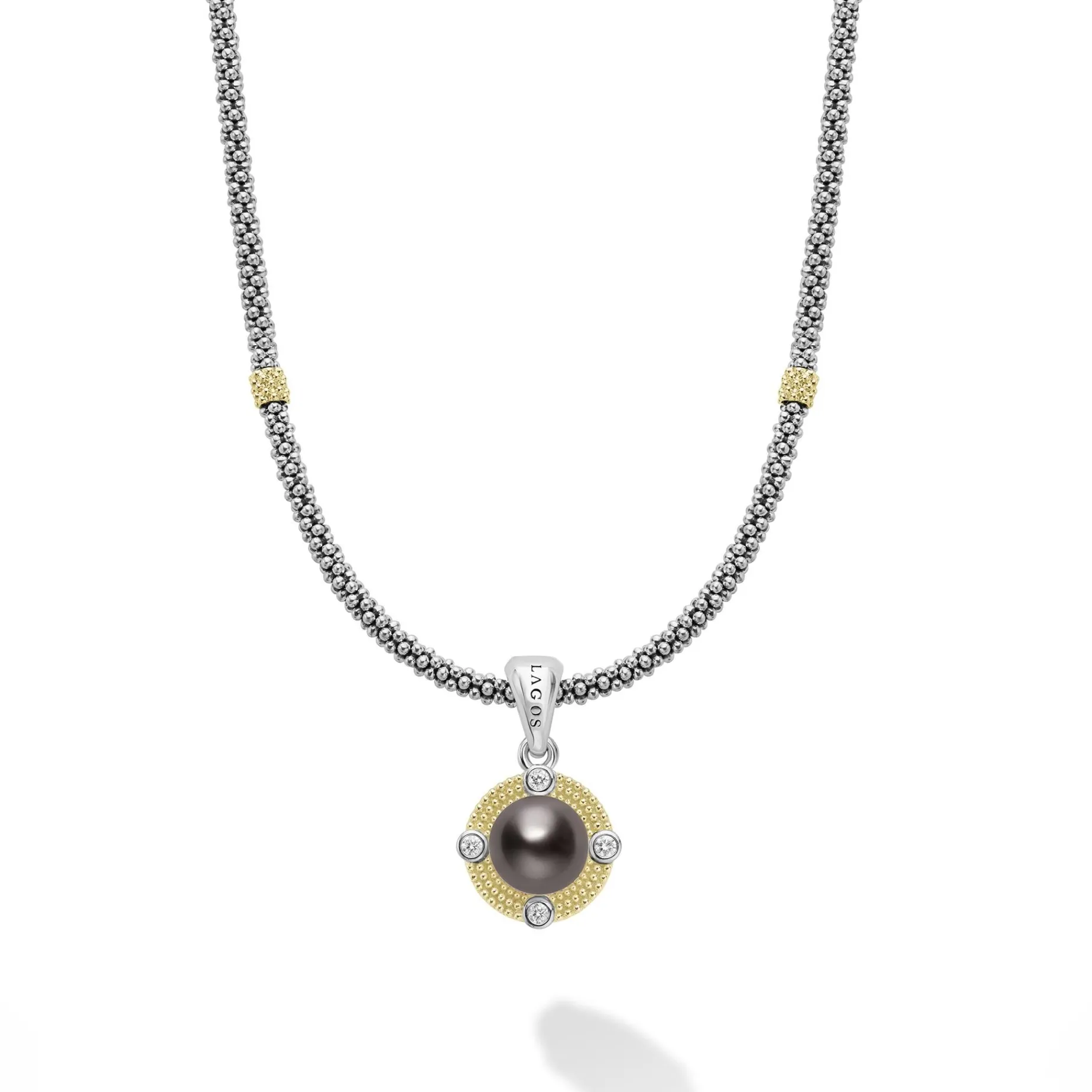 A Tahitian Black Pearl Surrounded By Diamonds And Smooth Sterling Silver Caviar Beading And 18K Gold Stations Forms This Necklace. Lagos Diamonds Are The Highest Quality Natural Stones. Length Offered In 16 Inches And 18 Inches.