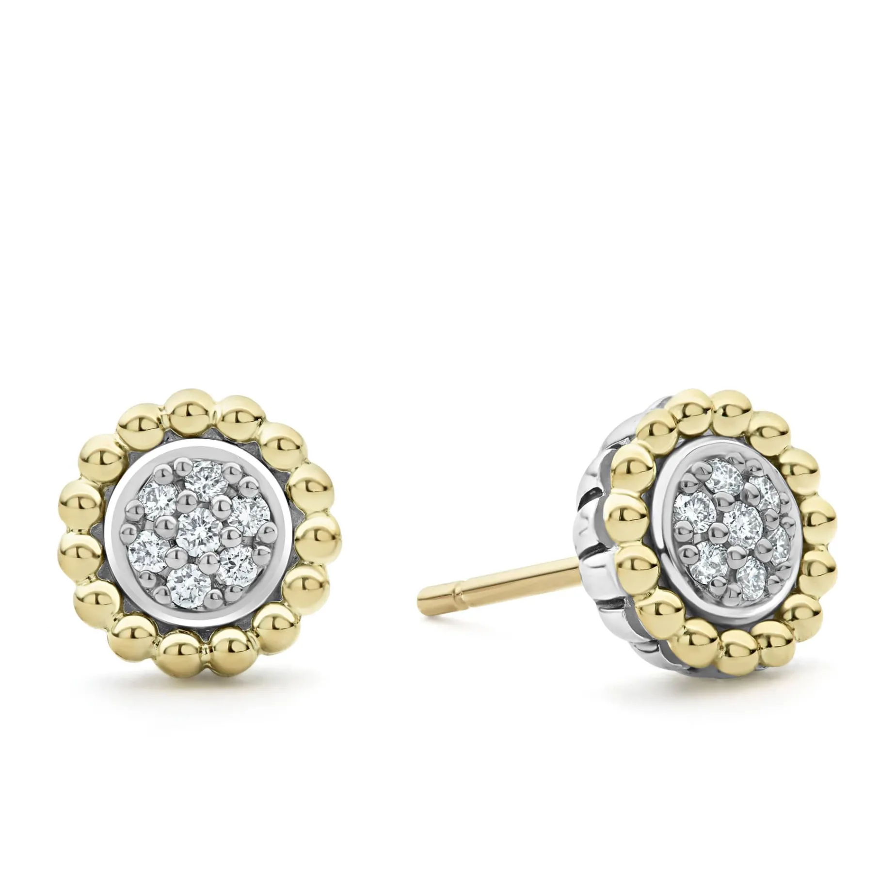 Pavé Diamond Circle Stud Earrings Framed By 18K Gold Caviar Beading. Lagos Diamonds Are The Highest Quality Natural Stones.