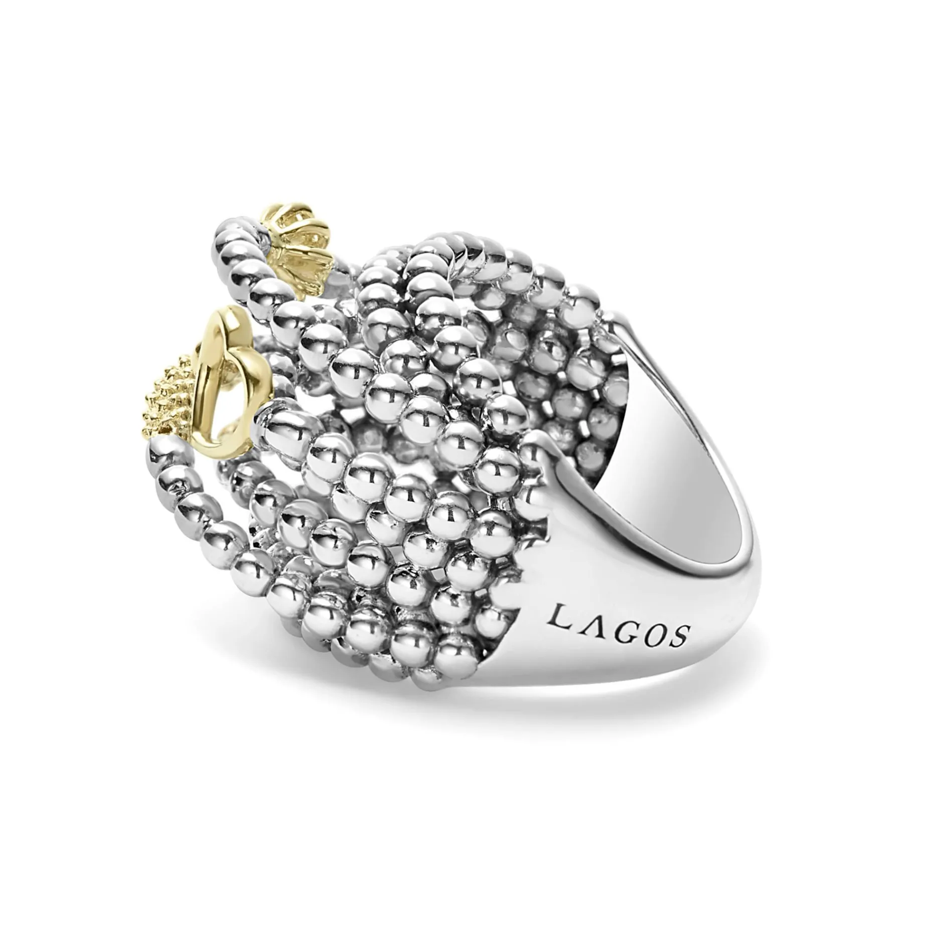 A Caviar Statement Ring In Sterling Silver With 18K Gold Caviar Beading, Fluting And A Heart Detail.