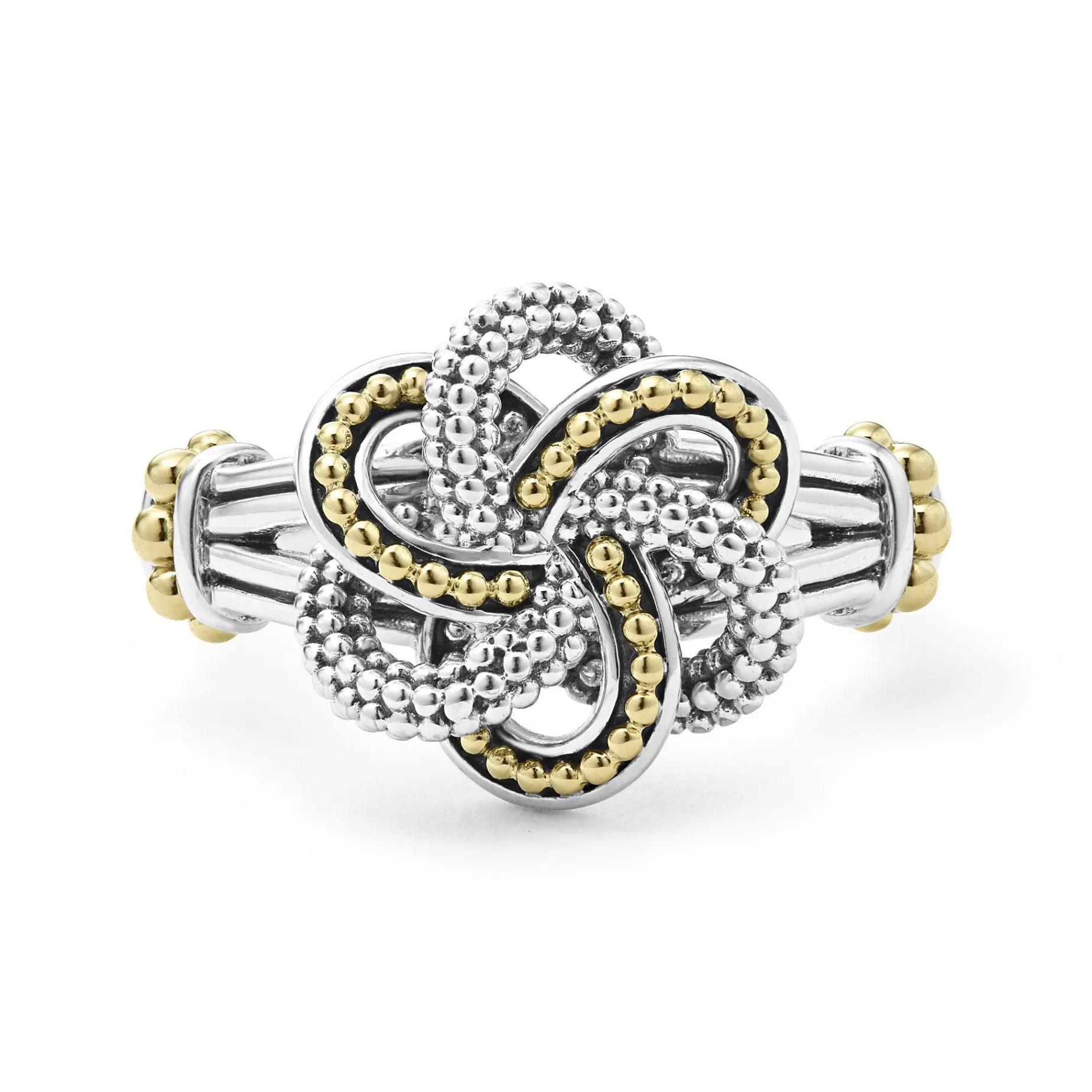 Bands Of 18K Gold And Sterling Silver Caviar Beading Form This Love Knot Ring.