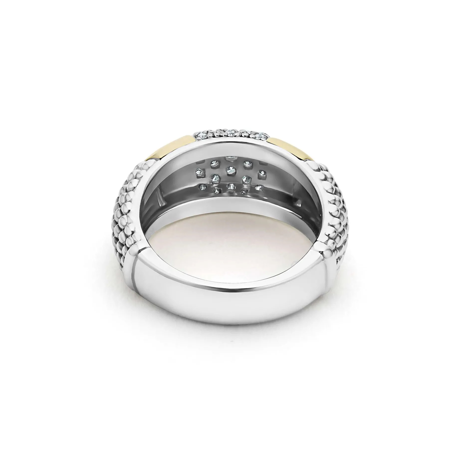 Diamonds And Smooth Stations Of 18K Gold Set By Sterling Silver Caviar Beading Form This Ring. Lagos Diamonds Are The Highest Quality Natural Stones.