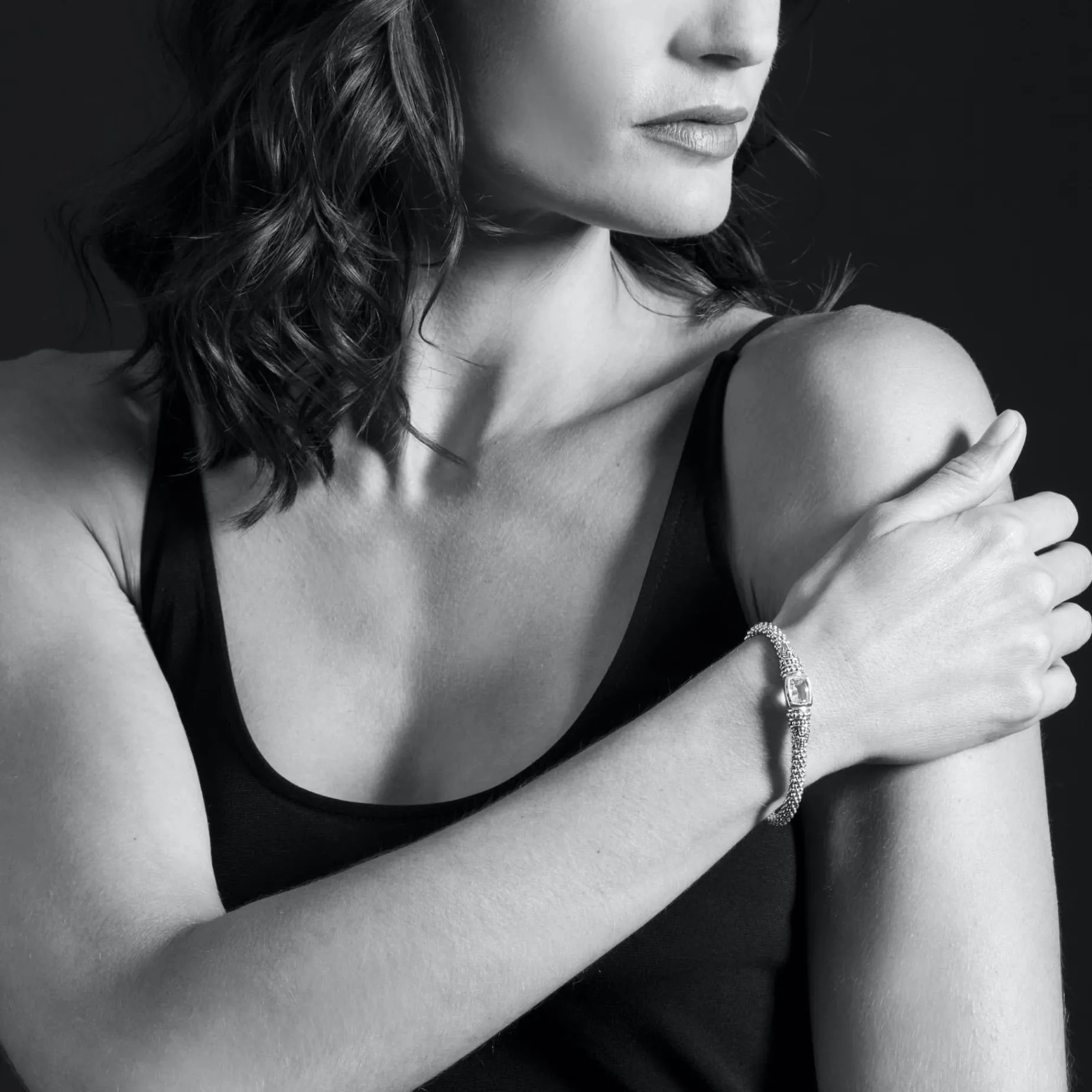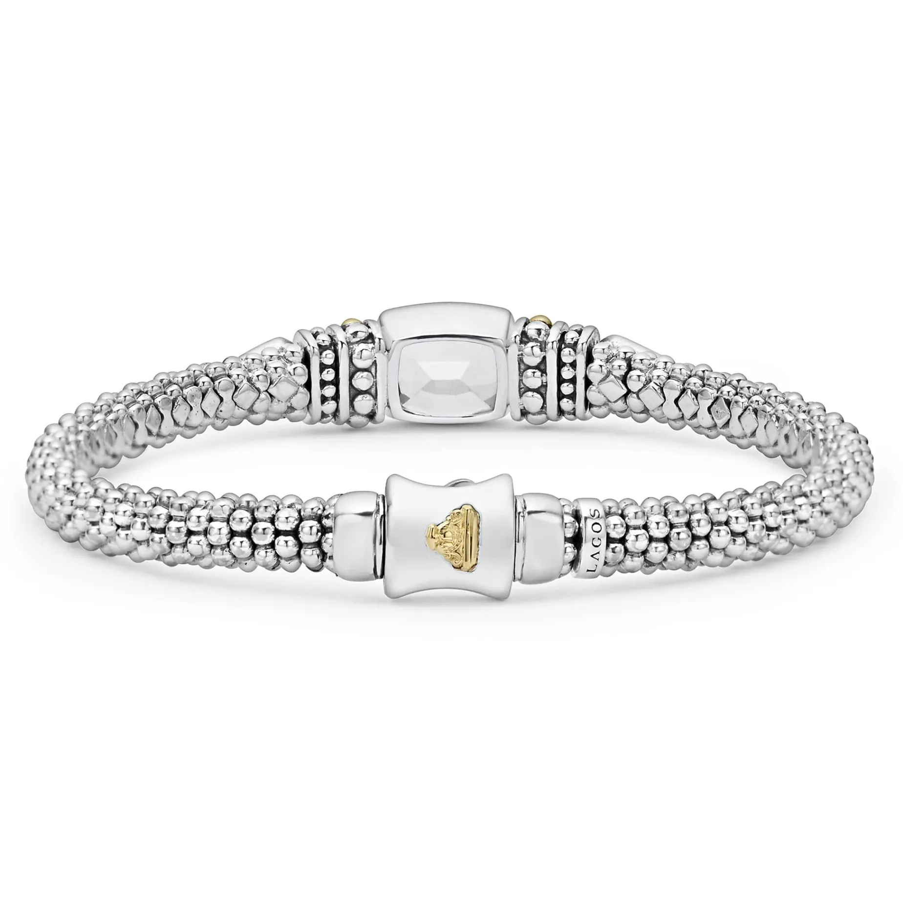 White Topaz Bezel-Set Gemstone And Sterling Silver Caviar Beading With 18K Gold Detailing Forms This Bracelet.